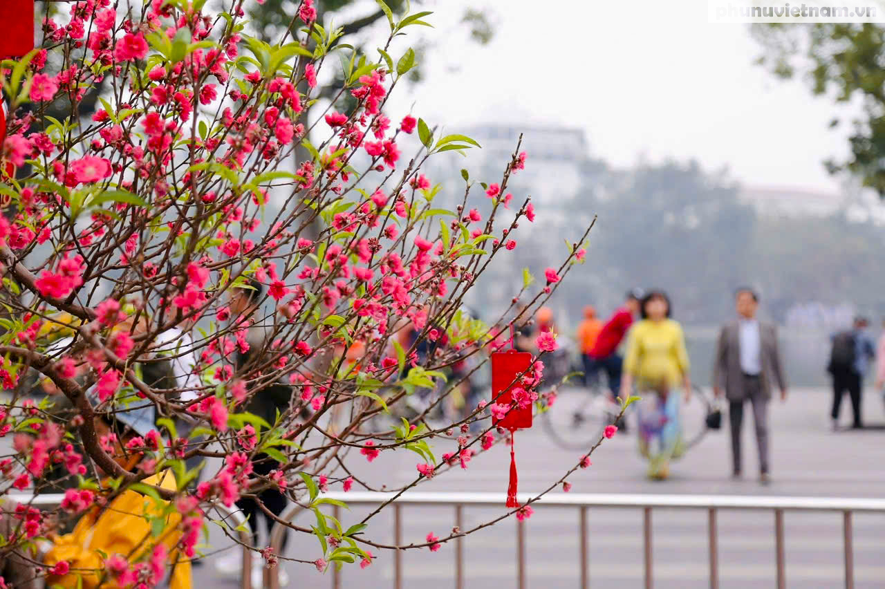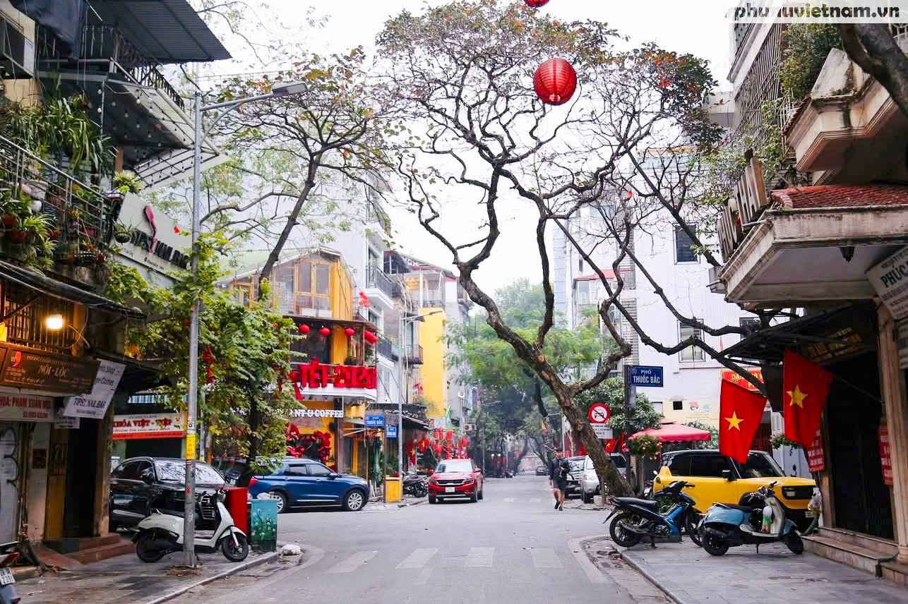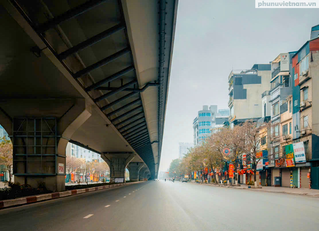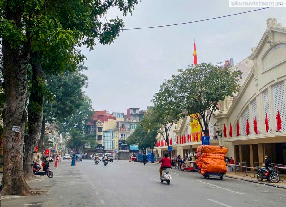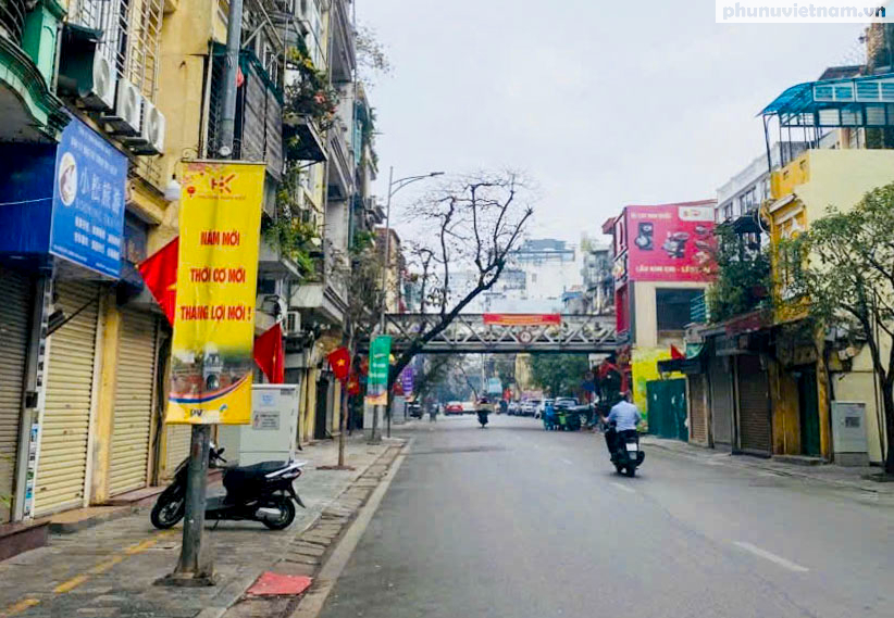 Các tuyến phố cổ rực rỡ cờ hoa nhưng vắng bóng người xe. Không còn tiếng còi ồn ã của giờ cao điểm, chỉ còn lại không khí đầu xuân yên bình, thư thái hiếm hoi trong năm.