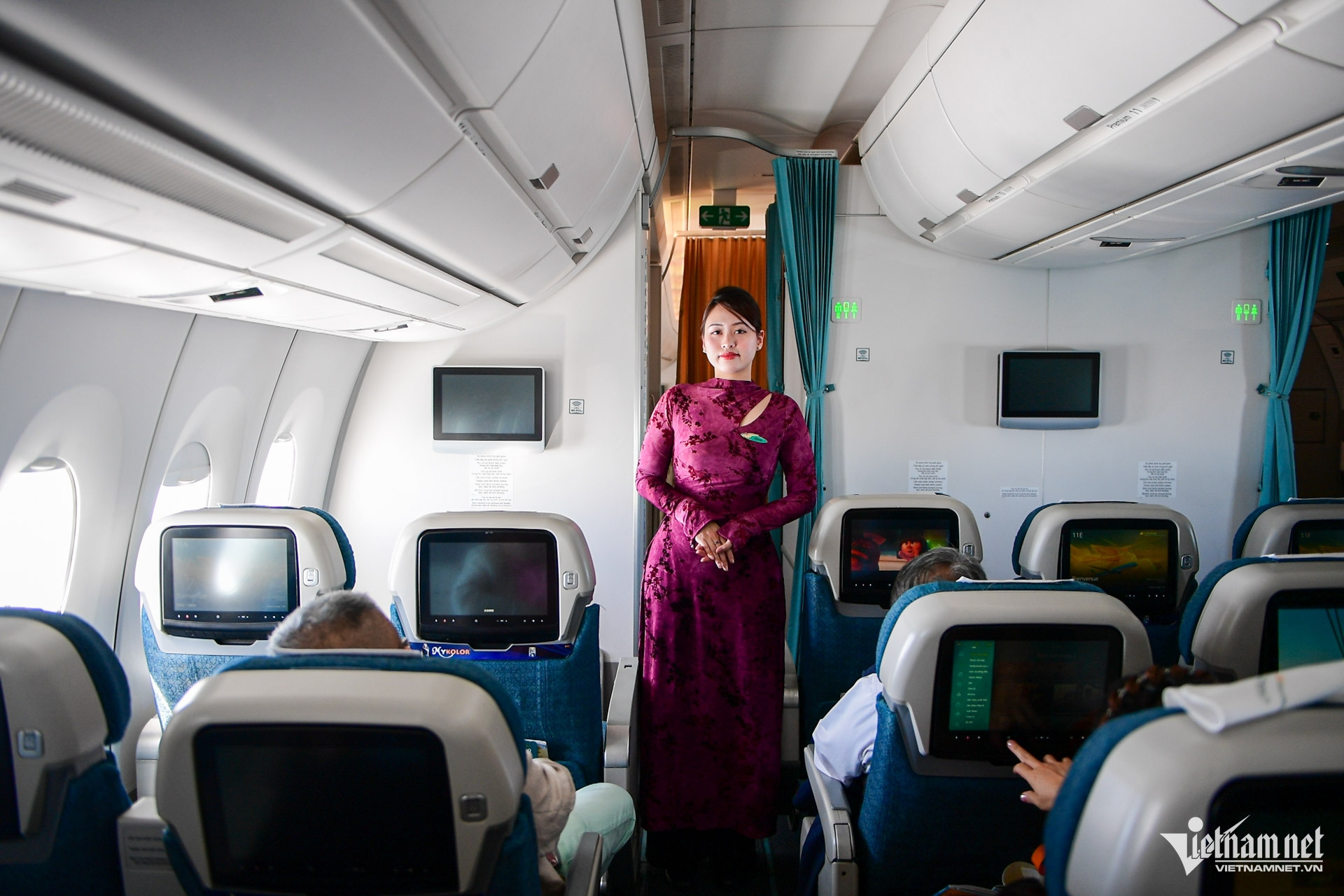Nữ tiếp viên Lê Minh Nhi cùng đồng nghiệp diện áo dài cách tân thay cho đồng phục thường ngày để phục vụ hành khách. “Được làm việc trên chuyến bay đầu năm trong tà áo dài truyền thống, tôi rất vui và tự hào”, cô chia sẻ.