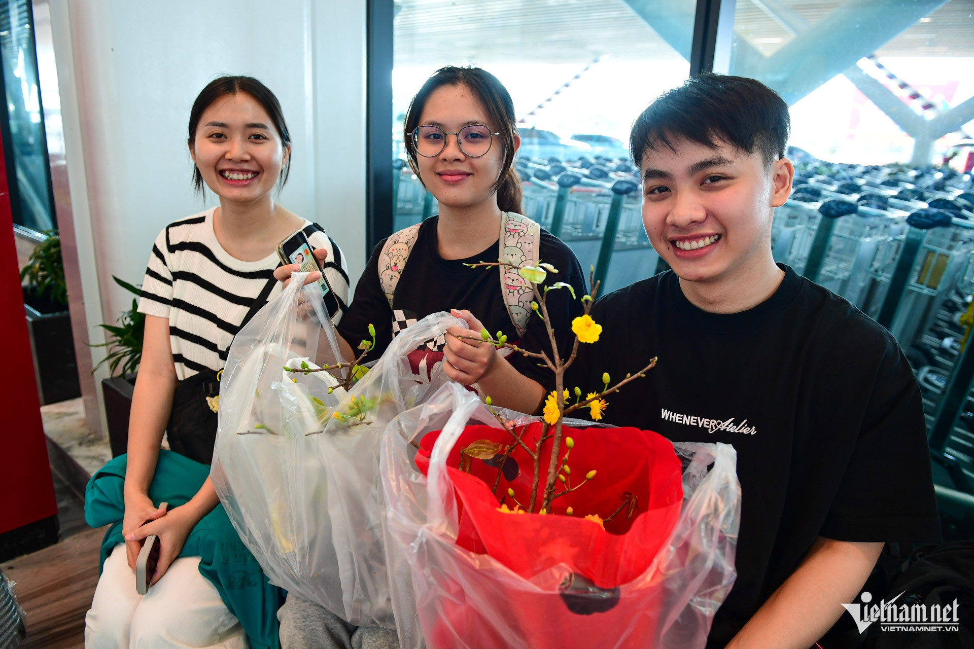 Ba bạn Hiếu, Linh và Nhung cho biết hai năm gần đây chọn ở lại TPHCM đón giao thừa để trải nghiệm không khí khác biệt, sau đó mới bay về quê khi giá vé “hạ nhiệt”. Cả ba còn mang theo 2 chậu mai vàng làm quà.