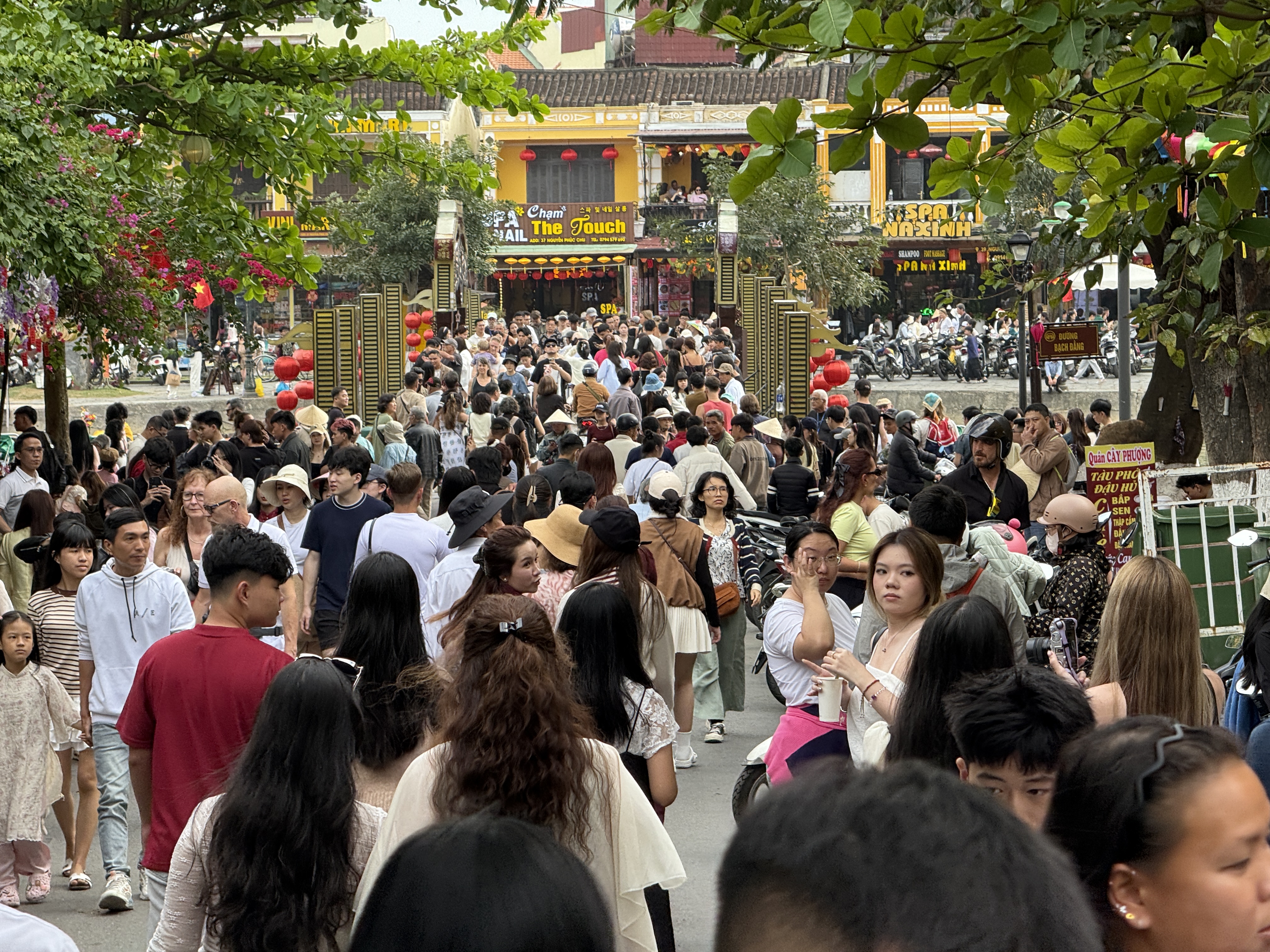 Theo ghi nhận, chiều 19-2 (mùng 3 Tết Bính Ngọ), đông đảo du khách đến tham quan, du xuân tại phố cổ Hội An. Các tuyến đường chính như Bạch Đằng, Nguyễn Thái Học, Trần Phú và khu vực xung quanh Chùa Cầu chật kín người.
