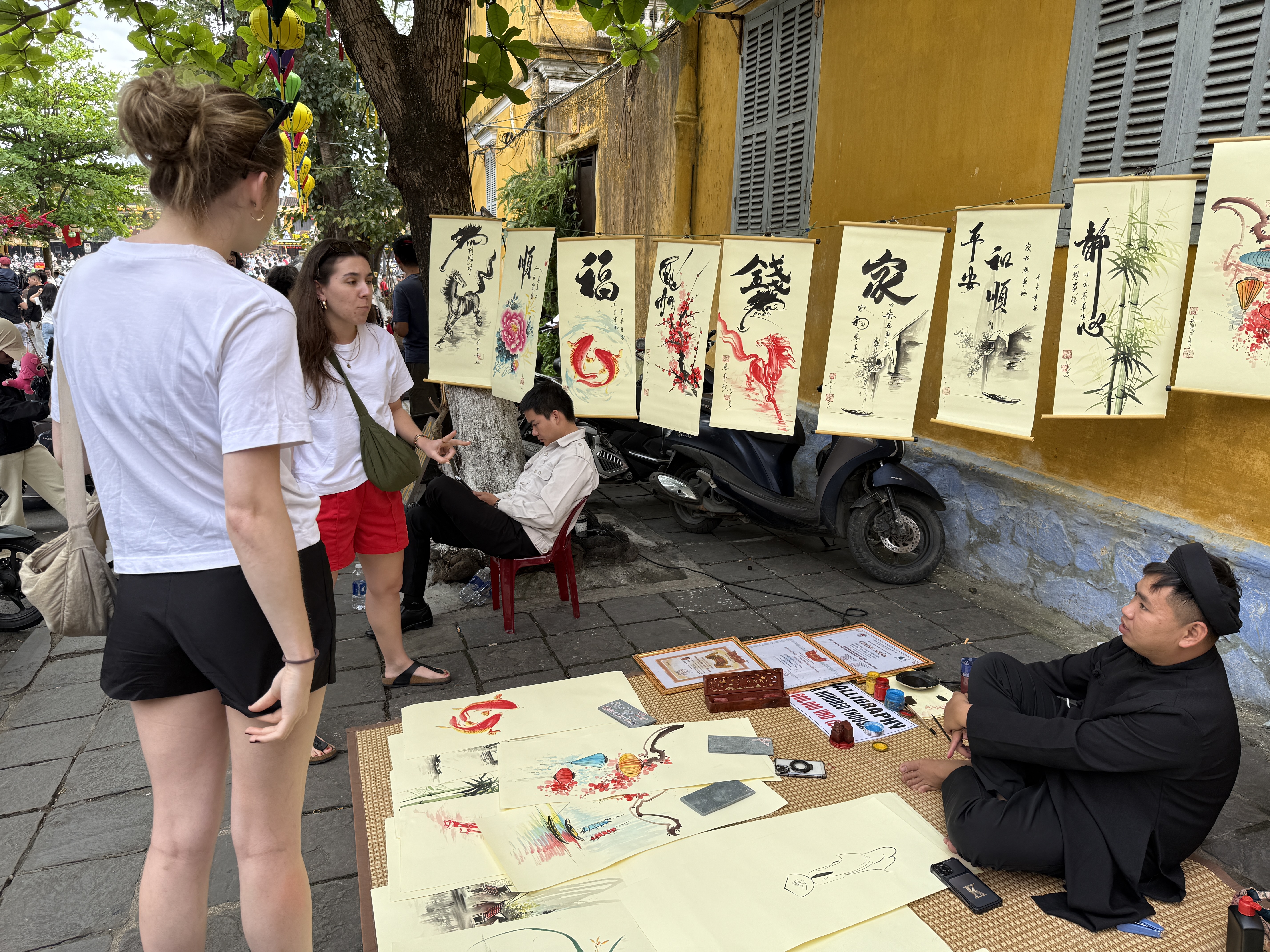 Du khách quốc tế tìm hiểu nghệ thuật thư pháp truyền thống. Ảnh: NGUYỄN CƯỜNG