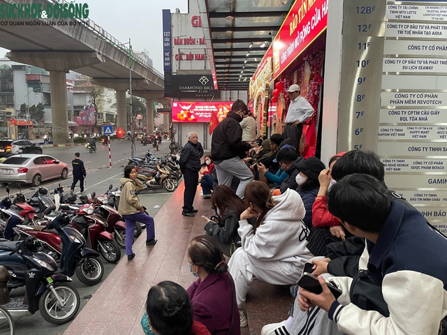Từ sớm ngày 24/2 (mùng 8 Tết), trước các cửa hàng vàng trên đường Cầu Giấy (Hà Nội) đã rực lên ánh đèn đỏ và sắc trang trí ngày vía Thần Tài. Dưới mái hiên của một cửa hàng vàng nổi tiếng, hàng chục người đã ngồi kín các bậc tam cấp, tay cầm điện thoại, áo khoác dày, lặng lẽ chờ tới lượt mua vàng.