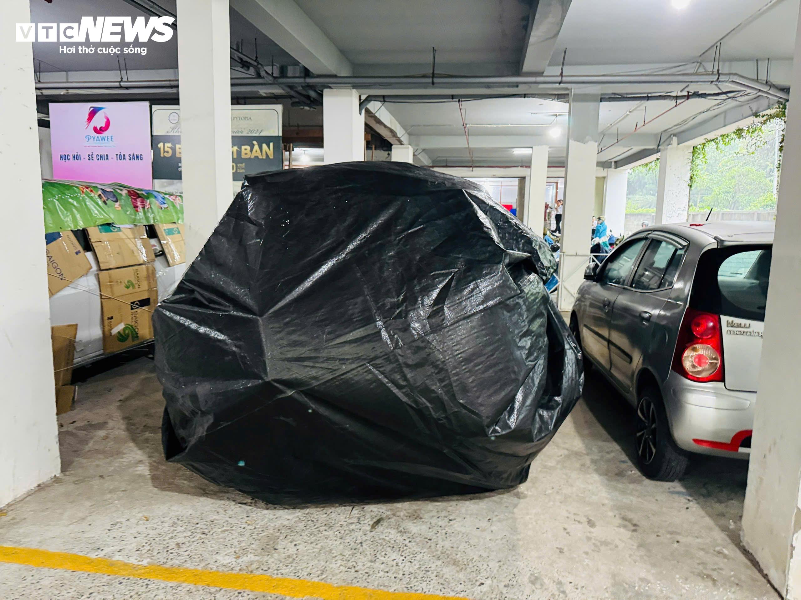 Xe ô tô tại các hầm chung cư cũng được người dân bọc bằng vải bạt chống nước, đề phòng nước dâng, tràn vào.