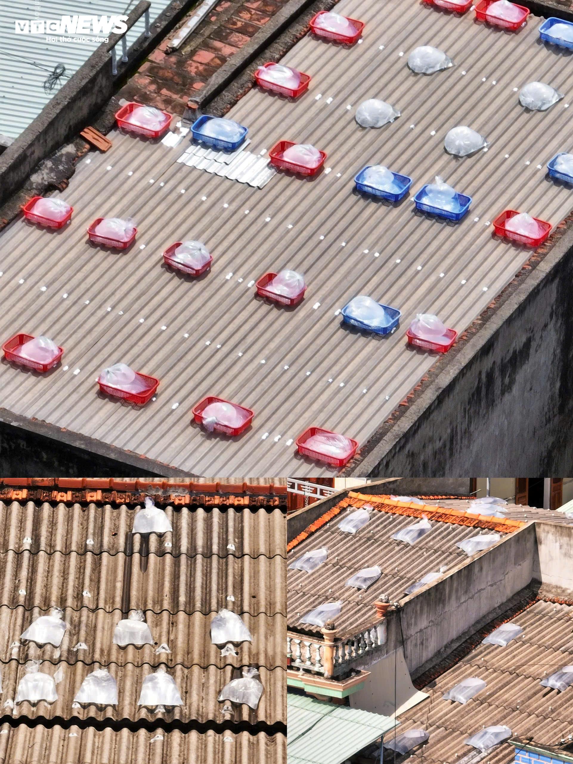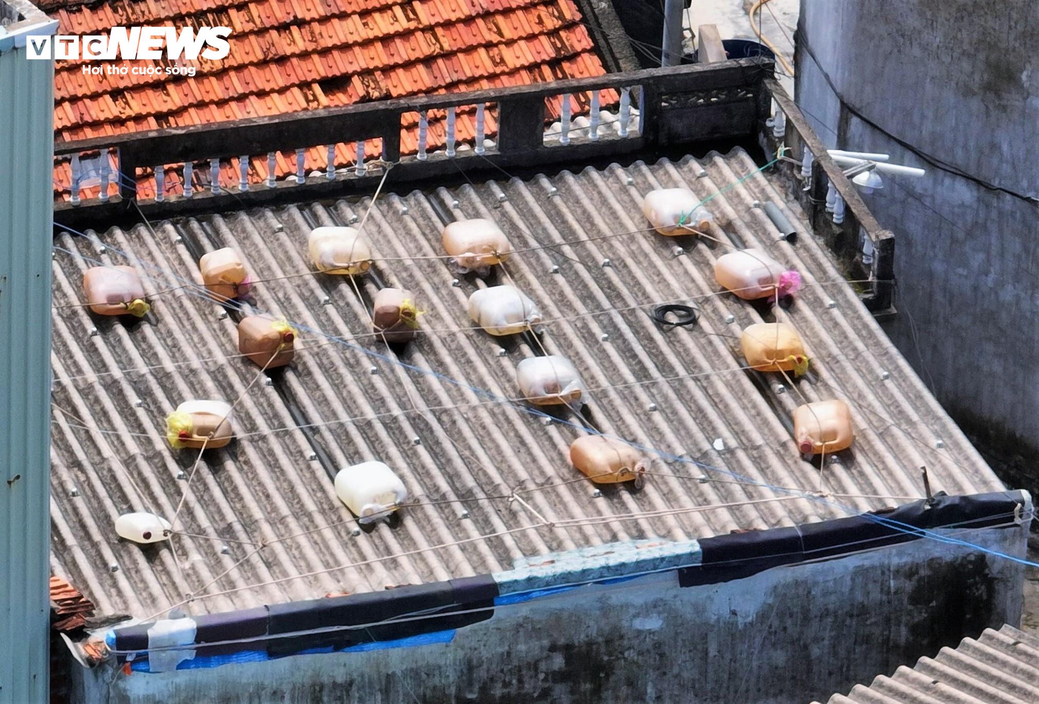 Ngoài các bao cát, ngư dân làng chài còn tận dụng tất cả các vật dụng, thiết bị liên quan đến nghề biển để chứa nước, tạo sức nặng chằng chống cho mái nhà. Những thùng phi xanh cắt làm đôi, chuyên dùng đựng cá biển được ngư dân đổ đầy nước gia cố mái nhà.