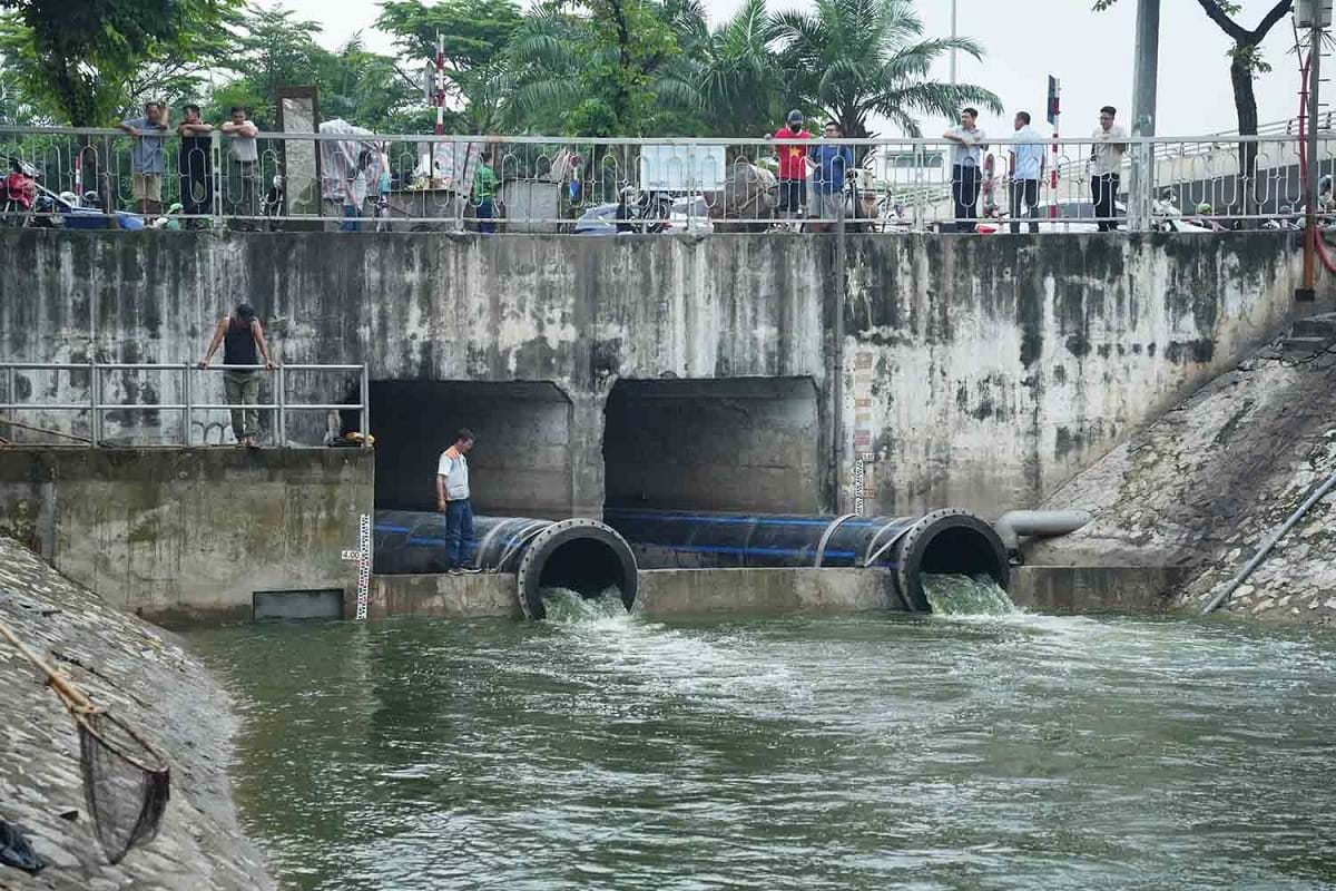 Nước sông Hồng được dẫn qua kênh Thụy Phương đến Phạm Văn Đồng, tới khu đô thị Tây Hồ Tây - vành đai 2,5 - đường Hoàng Quốc Việt ra sông Tô Lịch. Ảnh: TTXVN