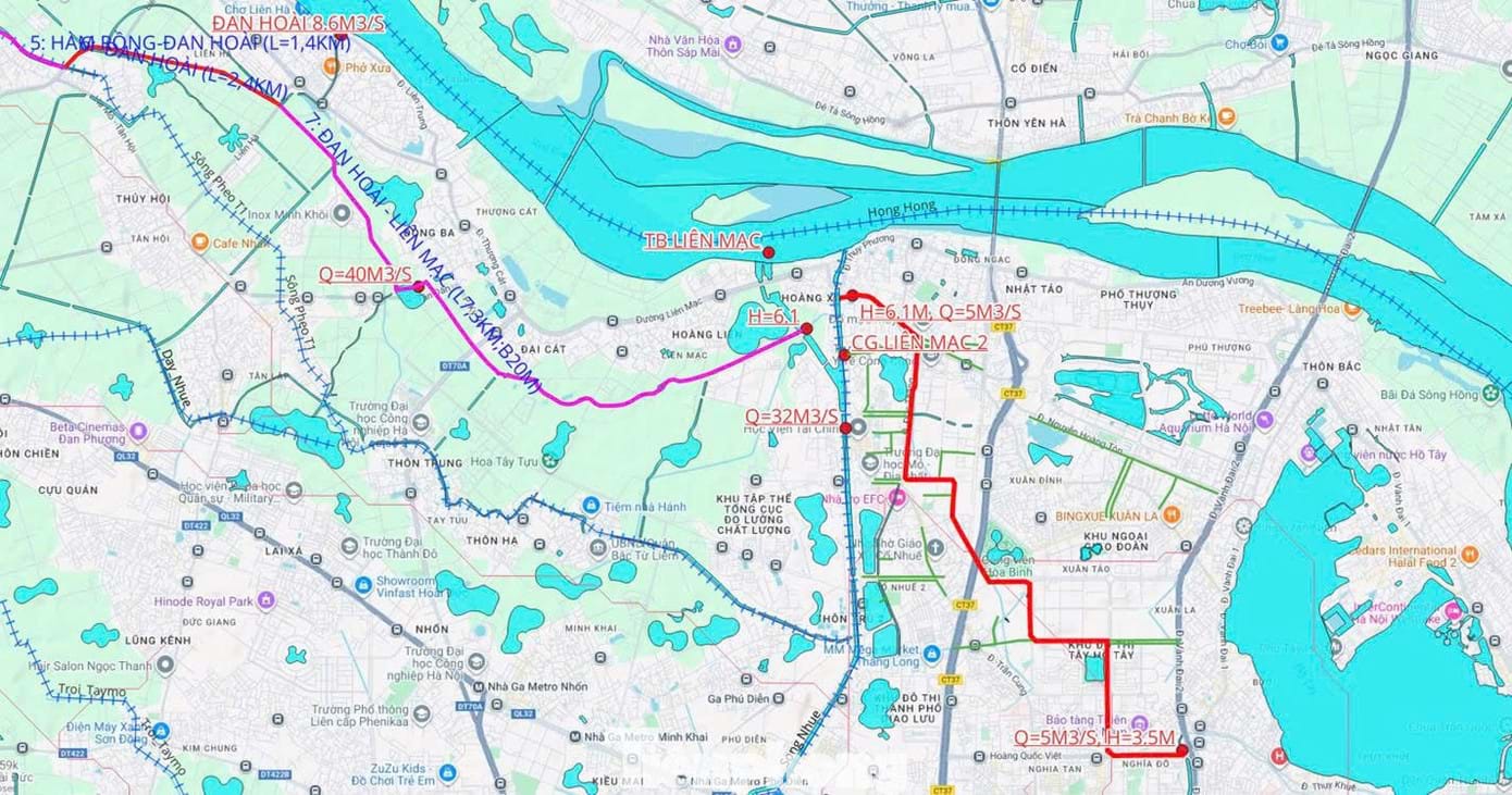 Hướng tuyến đường dẫn nước từ sông Hồng đến sông Tô Lịch (đoạn đường đỏ) thay thế cho phương án lấy nước sông Hồng bổ cập cho sông Tô Lịch theo dọc đường Võ Chí Công. Dự án có tổng chiều dài 7,73 km, được chia thành 9 đoạn; trong đó 3,47 km là kênh xây dựng mới và 4,3 km là kênh đã xây dựng cần cải tạo hoặc đã được phê duyệt.