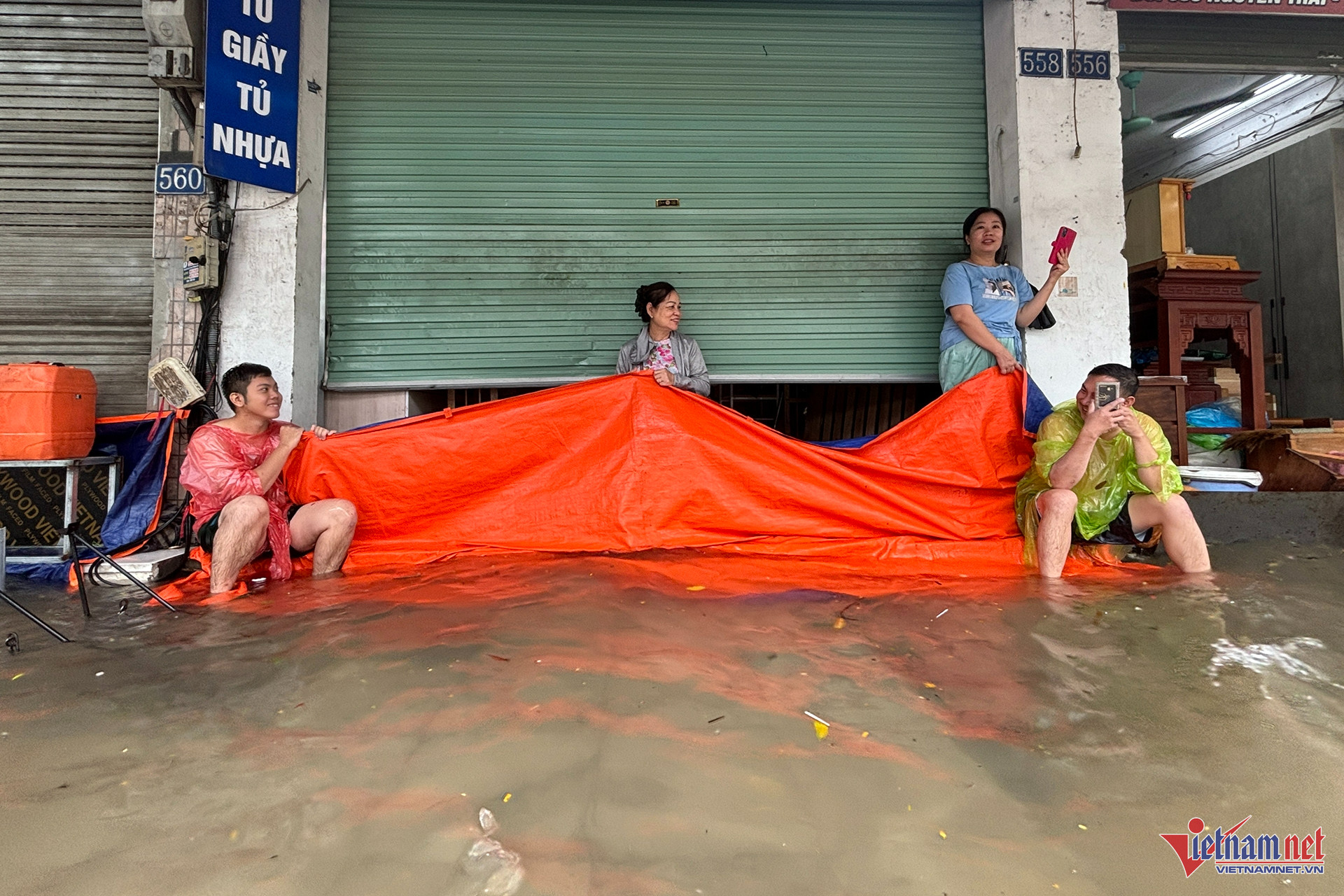 Nhà bà Khánh (ở số 558 Nguyễn Trãi, phường Thanh Xuân) cho biết: “Trong một tuần, hai lần nước tràn vào nhà. Hôm nay, tôi cùng con cháu phải căng bạt, đắp tạm ‘đê’ để ngăn nước. Cả buổi sáng, mấy cô cháu loay hoay dựng bạt chống ngập”.