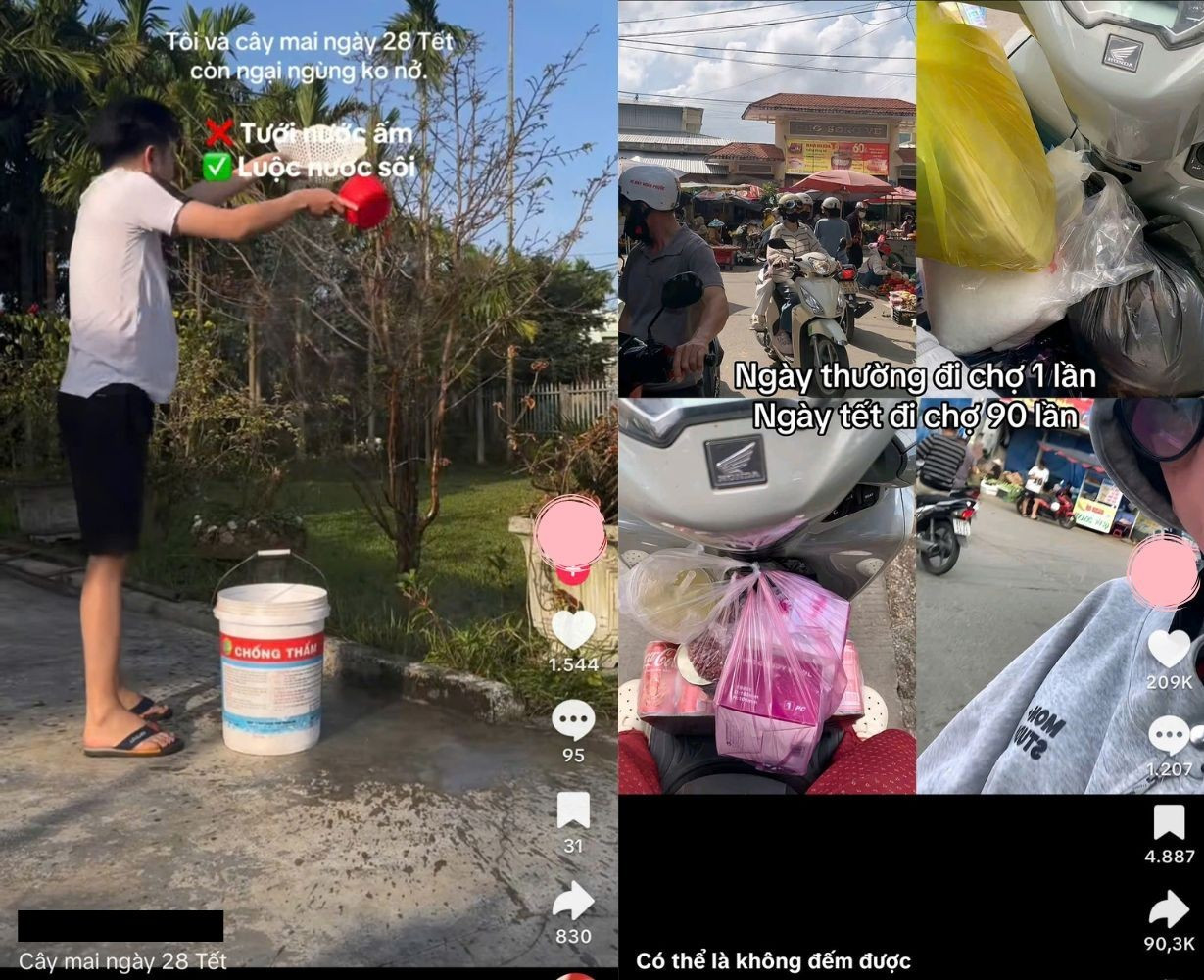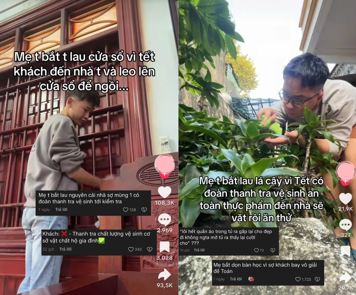 Những dòng chú thích hài hước, "khó vậy cũng nghĩ ra" khi đối diện với việc lau dọn nhà cửa cũng hút "triệu view". Gen Z cùng nhau biến những khoảnh khắc "toát mồ hôi" thành những tràng cười thả ga khi ví von: "Mẹ tui bắt tui lau từng cái lá cây vì sợ khách đến chơi Tết sẽ lao thẳng vào và nếm thử", "Mẹ tui bắt tui dậy sớm vì sợ khách đến sẽ vô nằm ngủ nướng với tui", "Ba bắt tui dọn sạch tủ lạnh vì sợ khách sẽ vô trỏng kiểm định an toàn thực phẩm",...