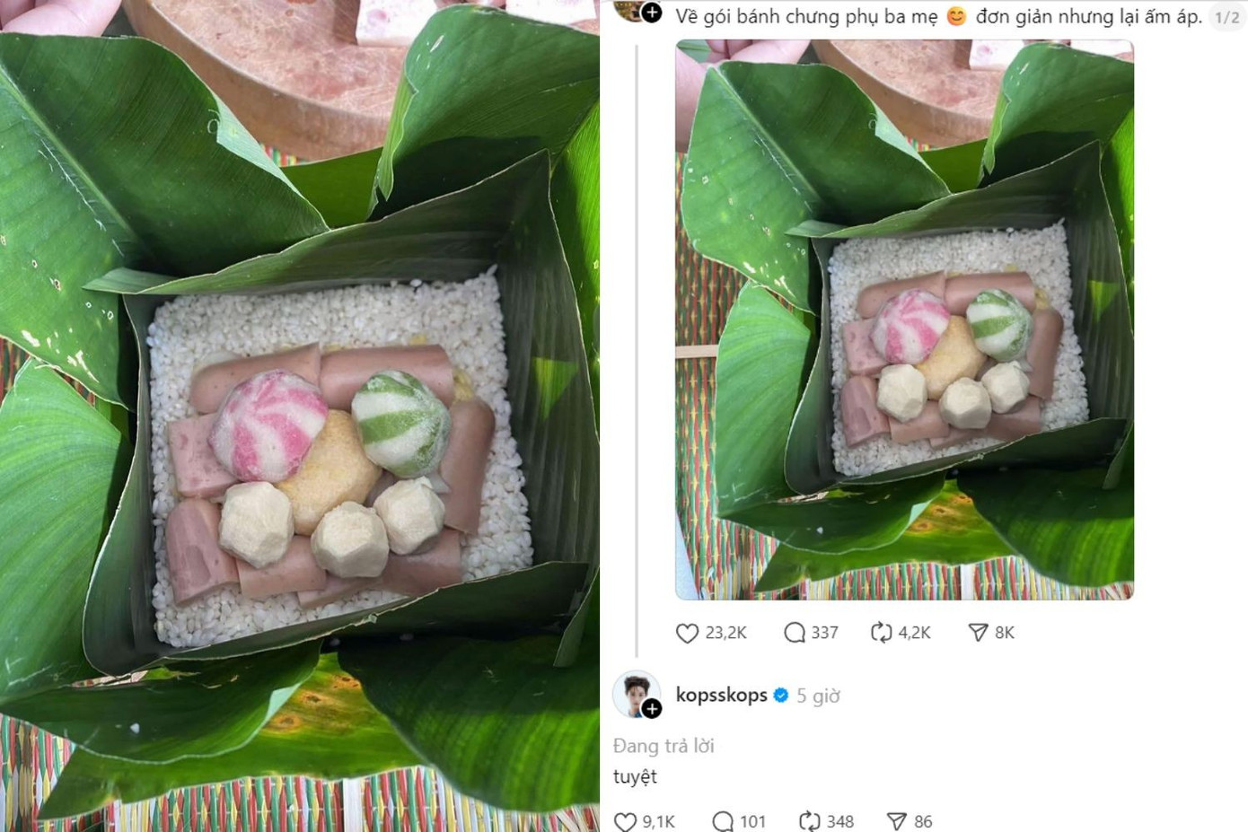 Trong lúc người người nhà nhà bắt đầu bày lá, nếp, đỗ, thịt để gói những đòn bánh tét, bánh chưng thì bài đăng của một bạn trẻ trên MXH Threads thu hút hơn 300K lượt đọc, 23K lượt thích cùng hàng trăm bình luận. Bạn hào hứng: "Về gói bánh chưng phụ ba mẹ, đơn giản nhưng lại ấm áp". Điều "độc lạ" là bức ảnh đi kèm lại là cái bánh chưng có nhân "xiên bẩn" khiến netizen chưa kịp cảm động đã thấy "cảm lạnh", đồng thời thảo luận rôm rả. Nhiều ý kiến hóm hỉnh mô tả về một thế hệ "cợt nhả" gia nhập đường đua "nữ công gia chánh", biến món bánh chưng truyền thống có thêm "màu sắc hiện đại".