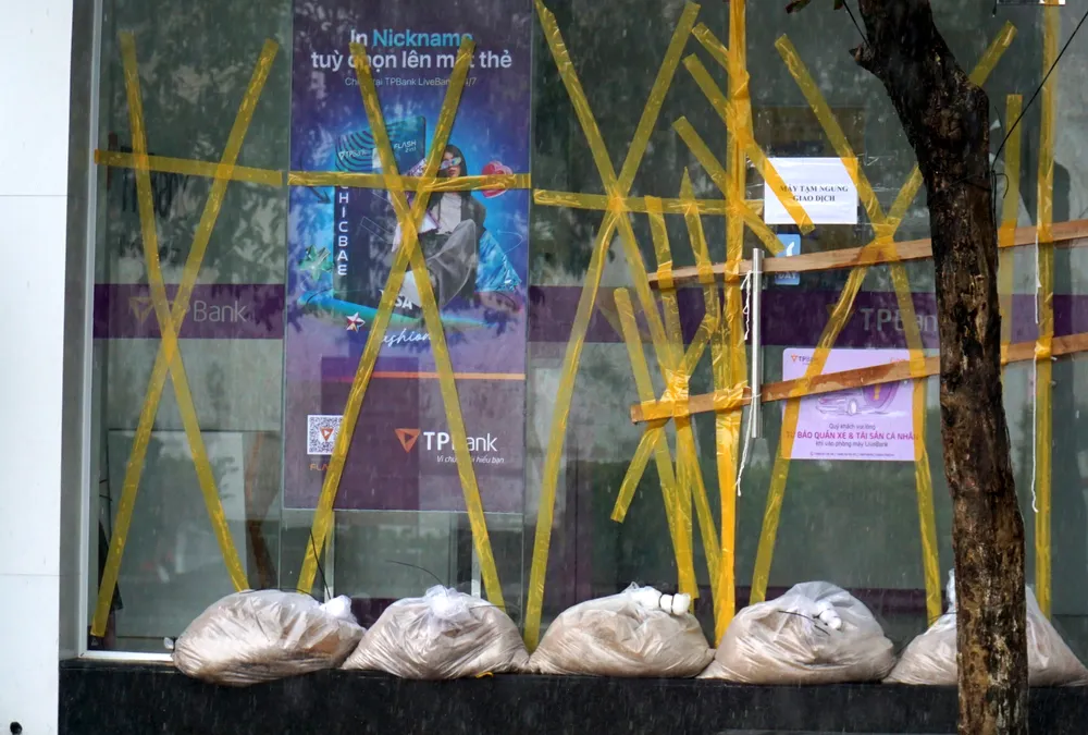 Một cửa hàng trên đường Diên Hồng dùng bao đất, băng keo để bảo vệ cửa kính cường lực.