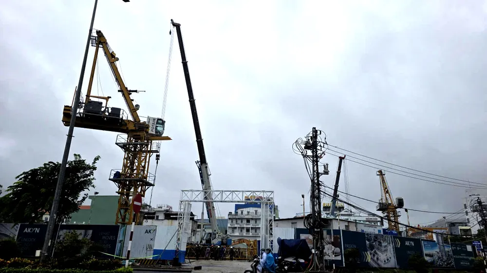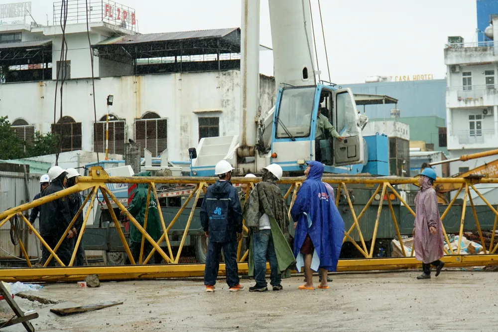 Các công trình xây dựng trên địa bàn cũng dừng hoạt động. Công nhân tất bật hạ cẩu tháp xuống để tránh bão số 13.