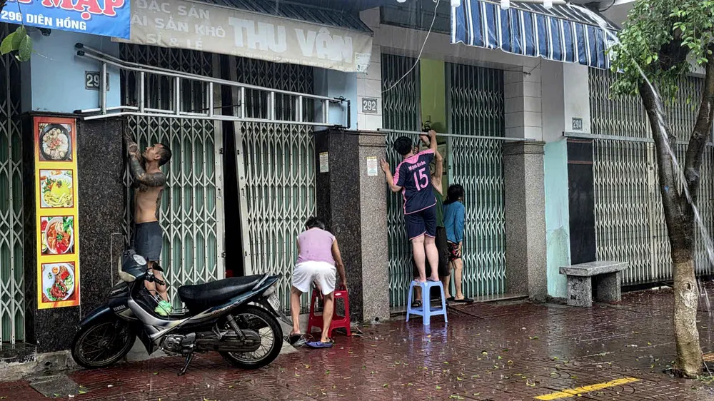 Theo ghi nhận của PV, những hàng cây trên đường Xuân Diệu ven biển Quy Nhơn đã được cắt tỉa cành lá. Người dân cũng dùng các thanh sắt lớn để gia cố cửa.