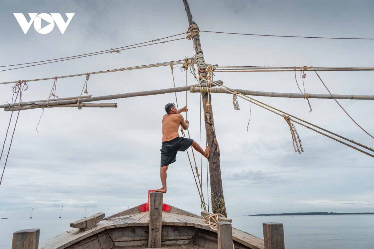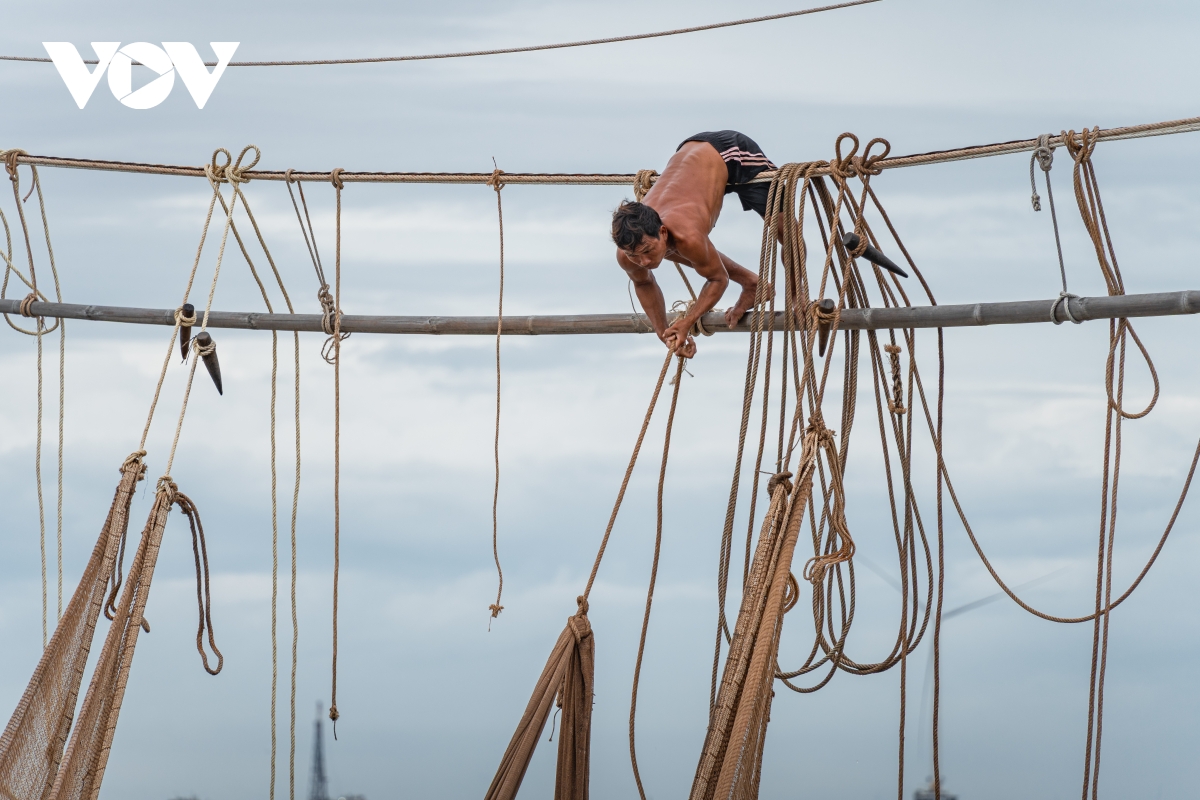 Ngư dân trèo lên cột buồm. Mọi động tác diễn ra thuần thục như một điệu nghệ đã đi cùng họ qua bao mùa biển.