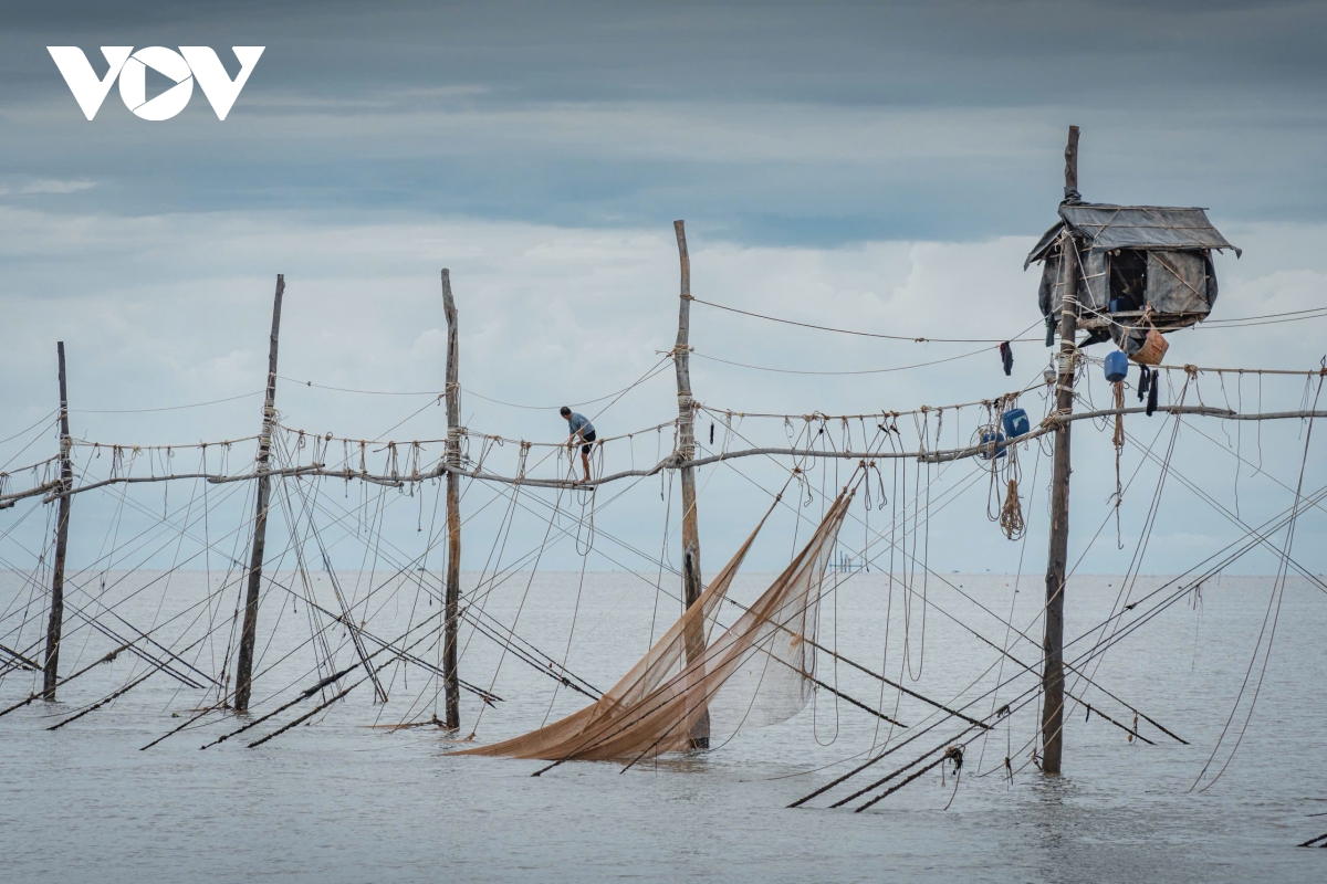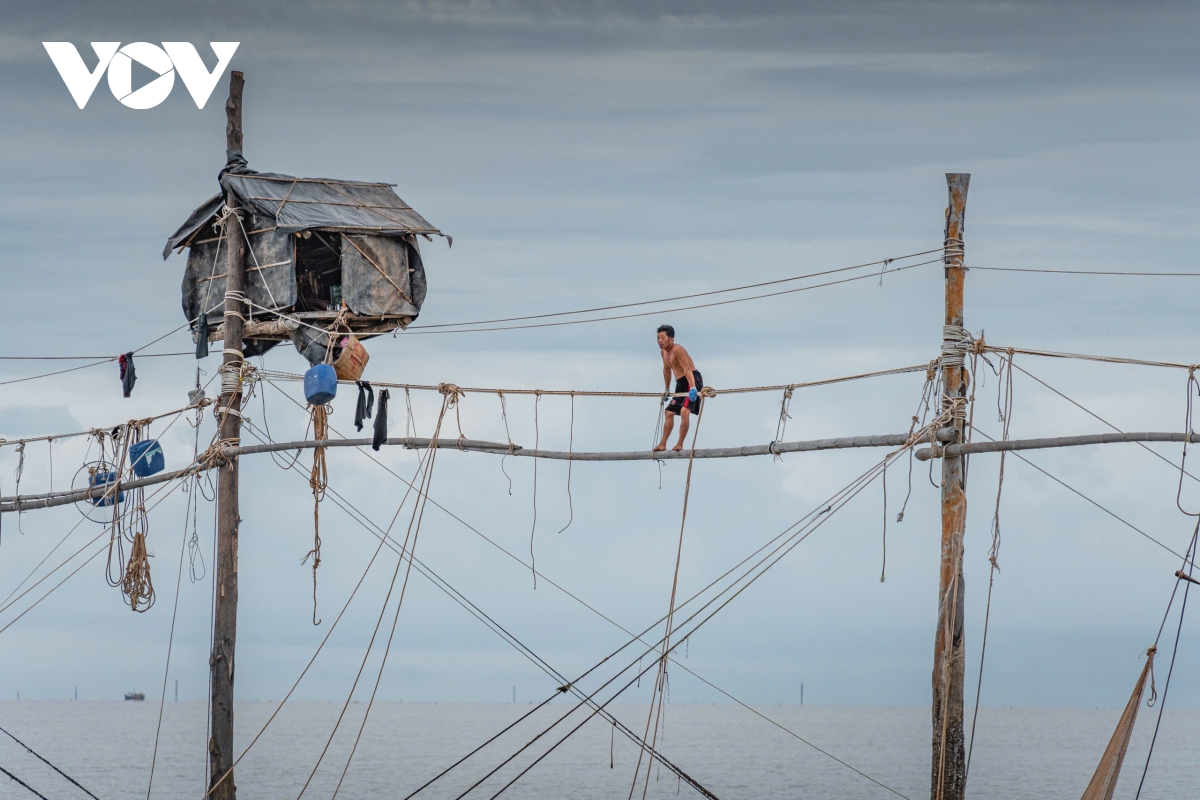 Một ngư dân đi trên xà ngang nối giữa các chòi canh để kiểm tra hàng đáy, bám trụ ngày đêm giữa gió chướng và sóng bạc đầu.