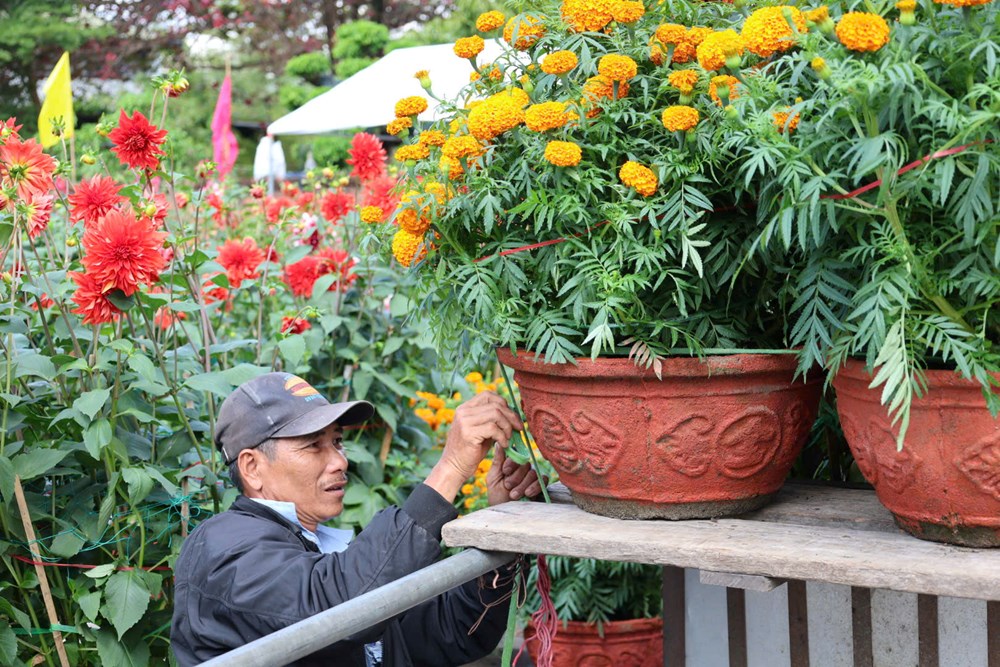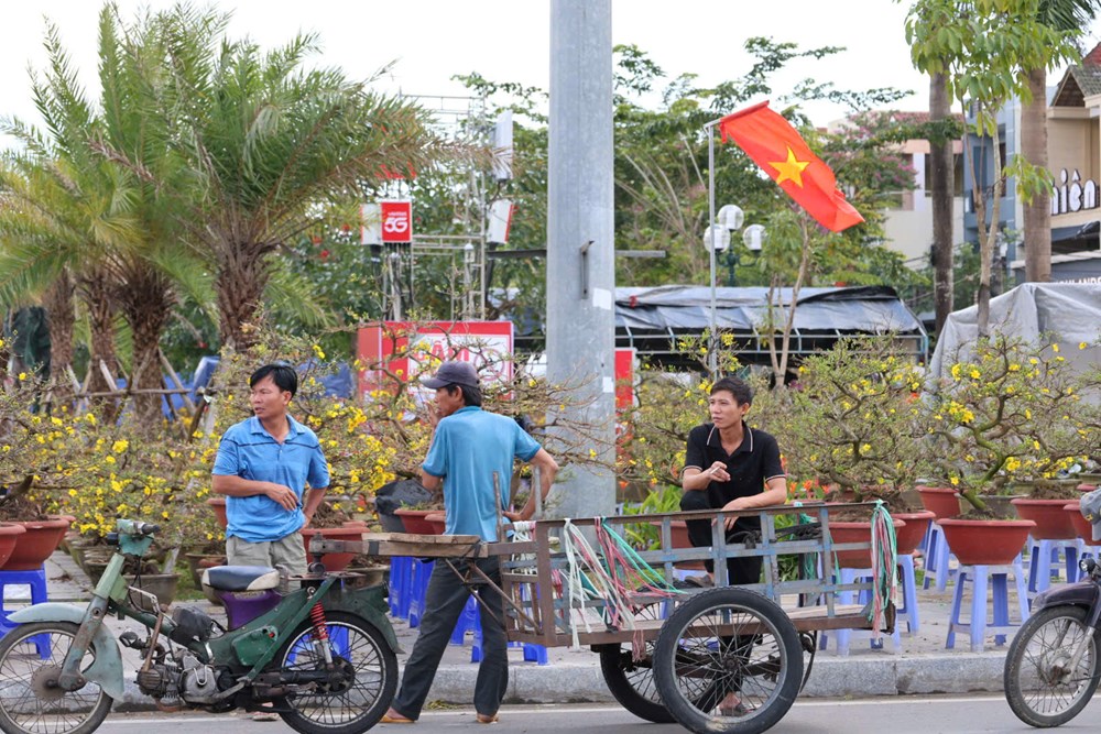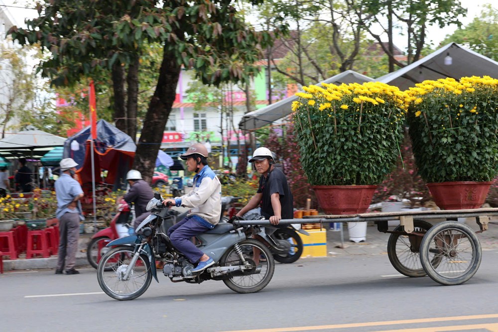 Tại mỗi điểm bán hoa, có khi hàng chục người kiên nhẫn chờ khách. Họ là thợ xây, phụ hồ, tài xế xe ôm… tận dụng tính thời vụ để tăng thu nhập. Những chiếc xe máy gắn thêm giá đỡ, xe kéo phía sau trở thành phương tiện linh hoạt, len lỏi qua phố đông, đưa sắc vàng mai, đỏ thắm vạn thọ, xanh mướt quất cảnh về từng mái nhà.
