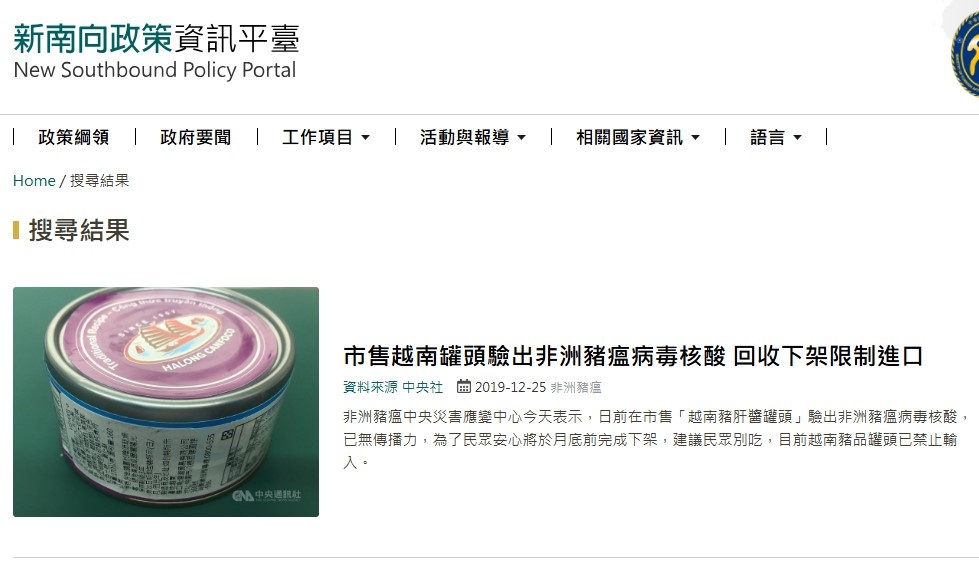 Theo thông tin từ Hãng thông tấn Trung ương Đài Loan (CNA), cuối năm 2019, Trung tâm Ứng biến Khẩn cấp Trung ương về dịch tả lợn châu Phi (CEOC) của Đài Loan đã phát hiện axit nucleic của virus dịch tả lợn châu Phi trong một sản phẩm pate gan heo đóng hộp xuất xứ Việt Nam đang được bày bán trên thị trường.