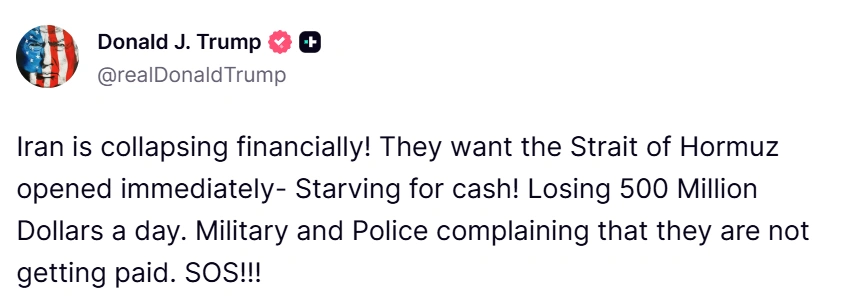 Trên mạng xã hội Truth Social, ông Trump nhận định, Iran không thực sự muốn đóng cửa eo biển Hormuz vì đây là tuyến vận tải chiến lược, mang lại khoảng 500 triệu USD mỗi ngày cho Tehran. Theo ông, các tuyên bố liên quan việc phong tỏa eo biển chủ yếu nhằm “giữ thể diện” trong bối cảnh Mỹ áp đặt sức ép trừng phạt.