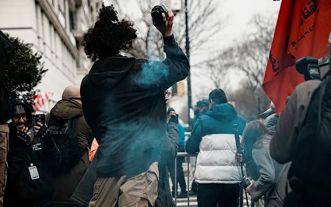 Một người đàn ông ném một chất nổ thủ công vào trong một cuộc biểu tình để ngăn chặn lời cầu nguyện của người Hồi giáo công cộng, tại thành phố New York. Ảnh: foxnews.com