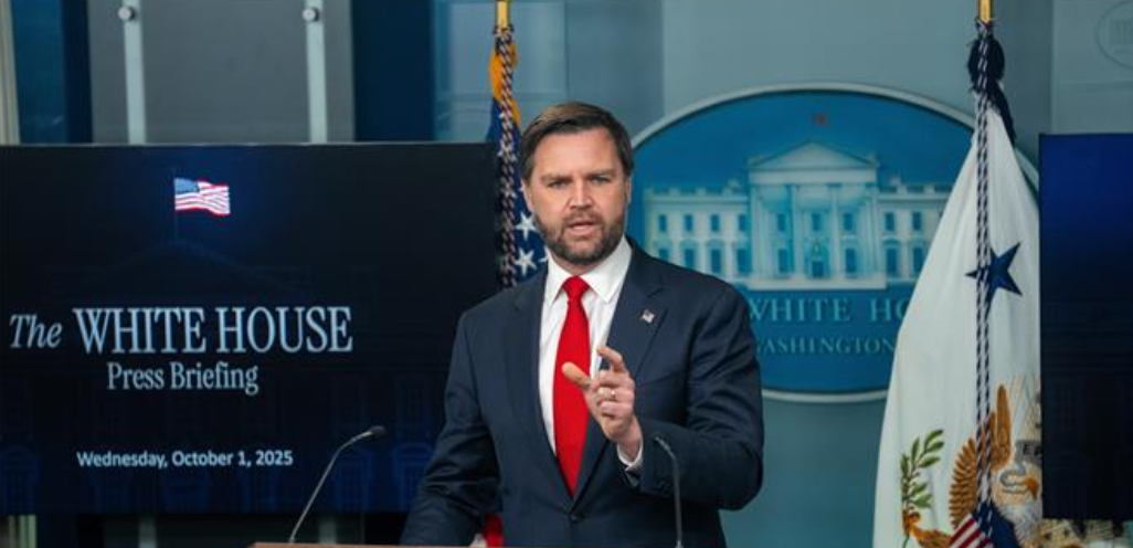 Phó Tổng thống Mỹ JD Vance trong cuộc họp báo tại Nhà Trắng, đề cập việc Chính phủ liên bang phải đóng cửa. Ảnh: THX