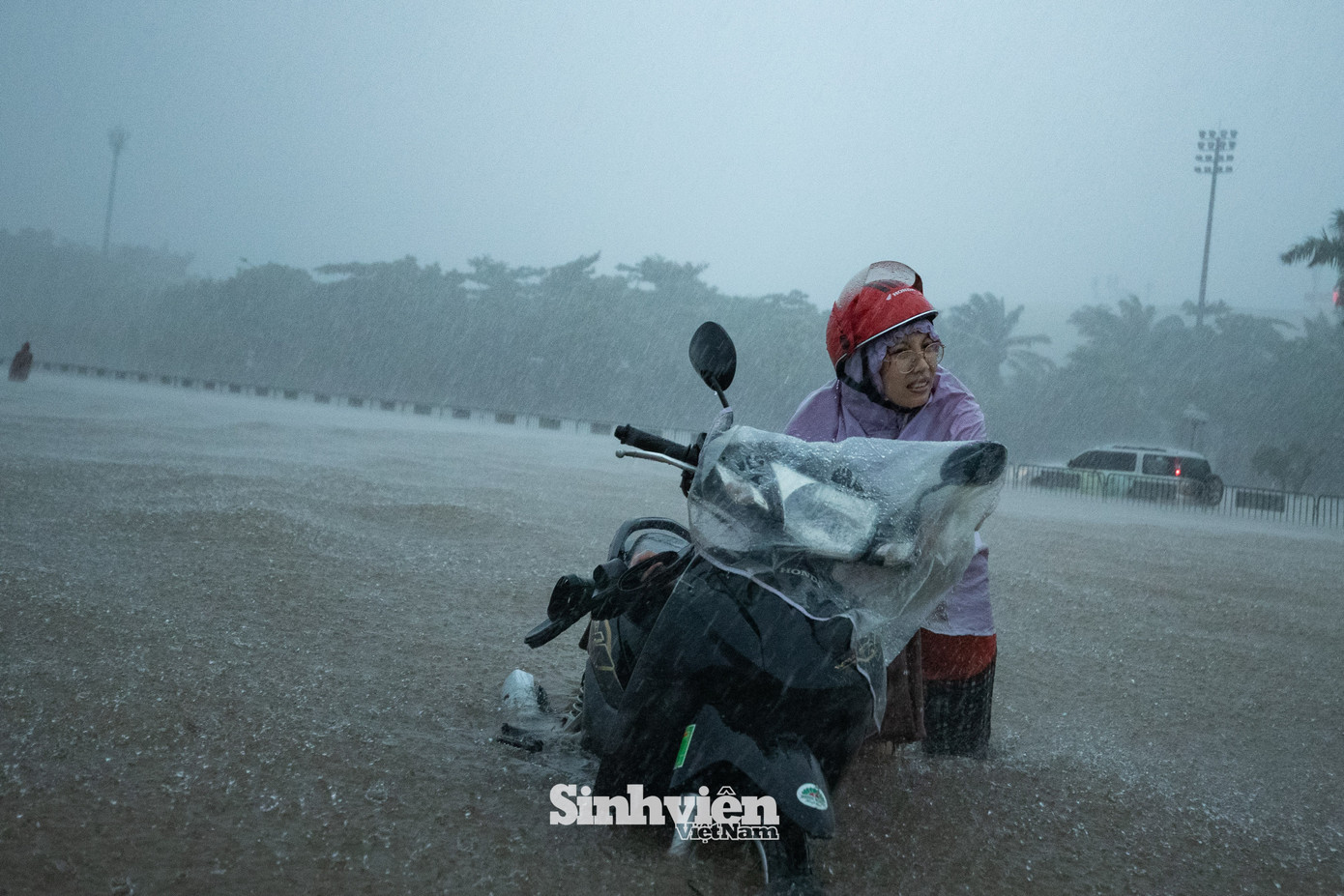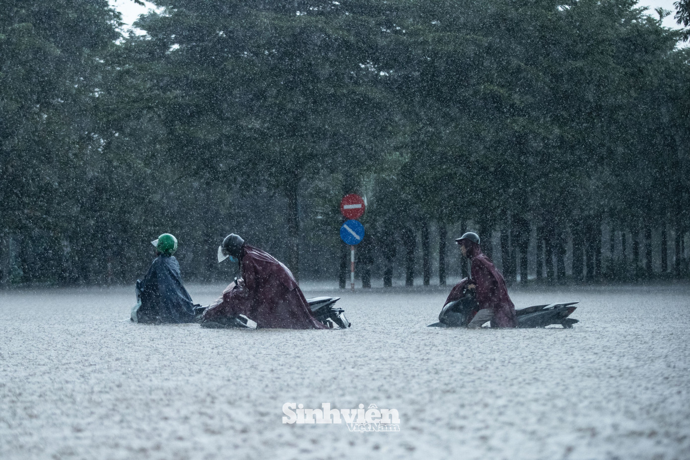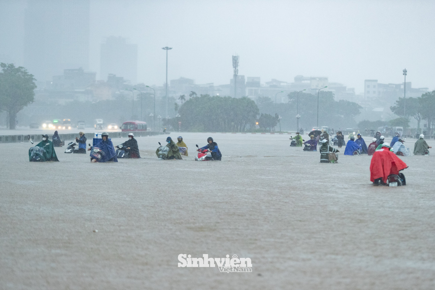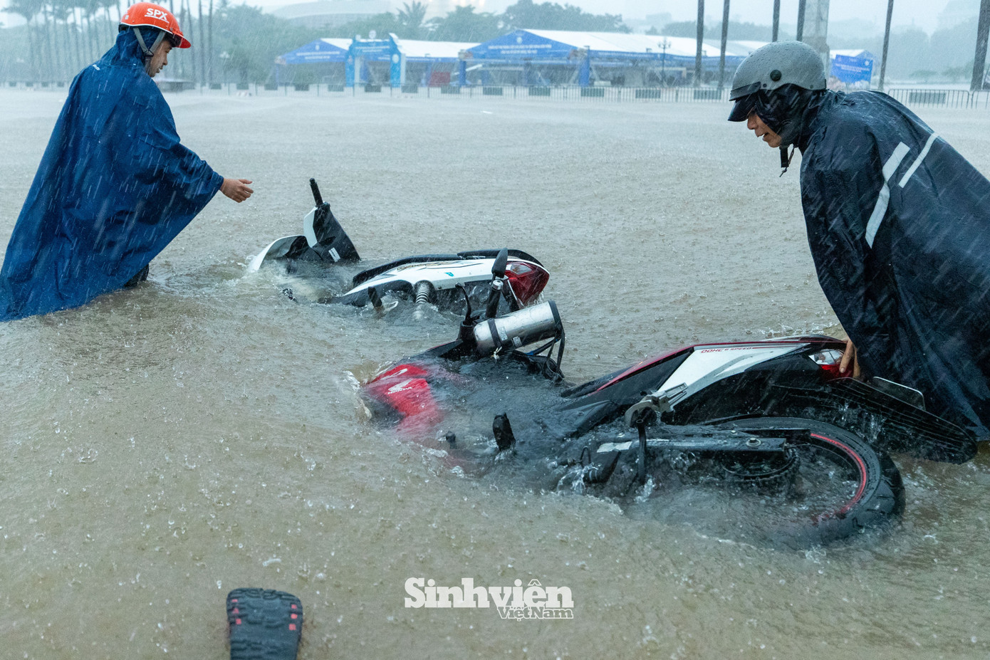 Mưa vẫn trắng xóa trời, tầm nhìn hạn chế. Bất chấp nguy hiểm, nhiều người dân vẫn cố gắng điều khiển xe máy, ô tô di chuyển qua các đoạn ngập. Những chiếc xe tải, xe buýt lớn đi qua tạo thành những đợt sóng mạnh, hất tung nước, khiến nhiều người đi xe máy loạng choạng, đổ xe giữa dòng nước.