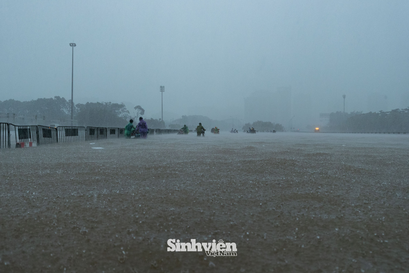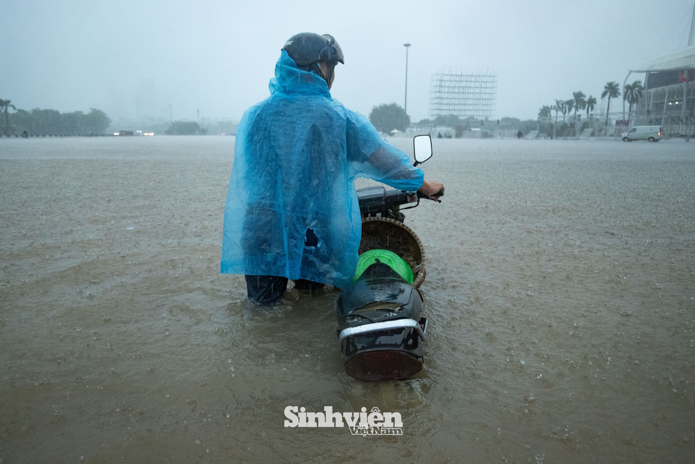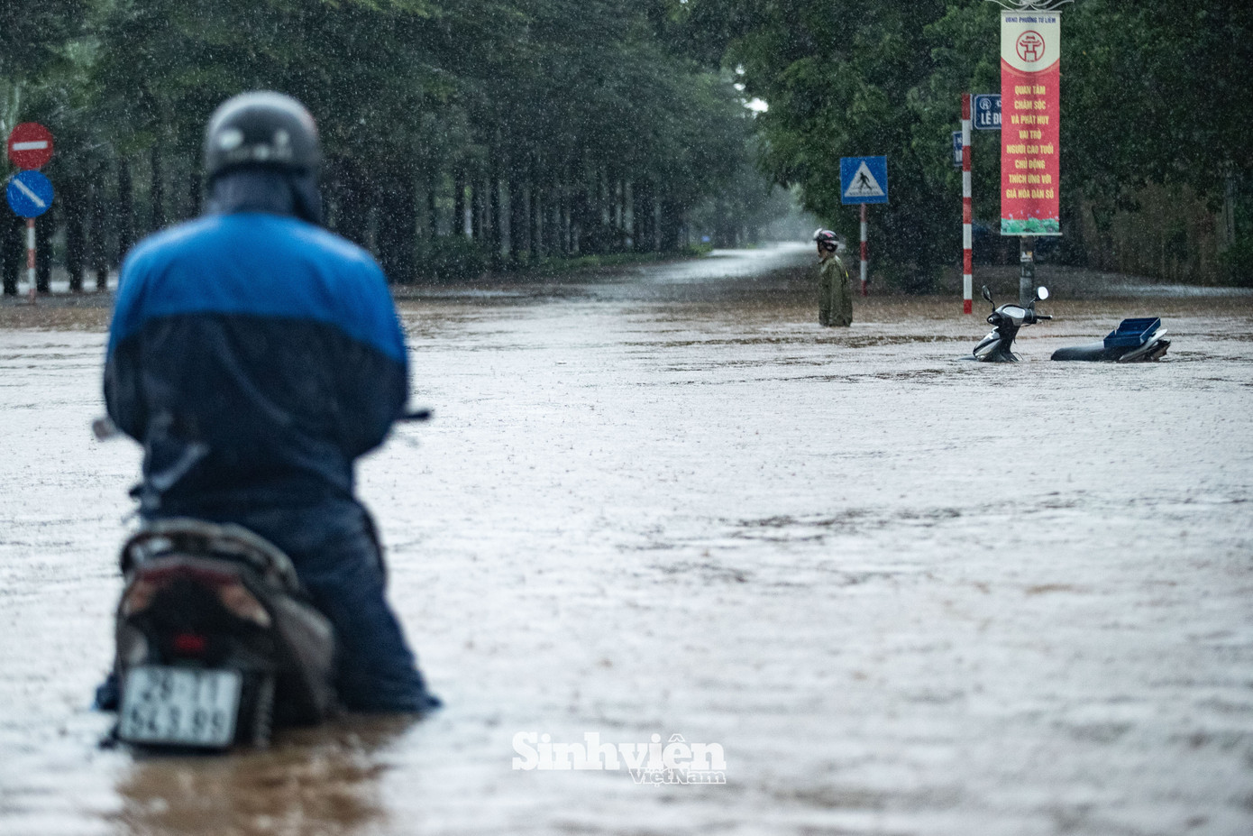 Mưa vẫn trắng xóa trời, tầm nhìn hạn chế. Bất chấp nguy hiểm, nhiều người dân vẫn cố gắng điều khiển xe máy, ô tô di chuyển qua các đoạn ngập. Những chiếc xe tải, xe buýt lớn đi qua tạo thành những đợt sóng mạnh, hất tung nước, khiến nhiều người đi xe máy loạng choạng, đổ xe giữa dòng nước.