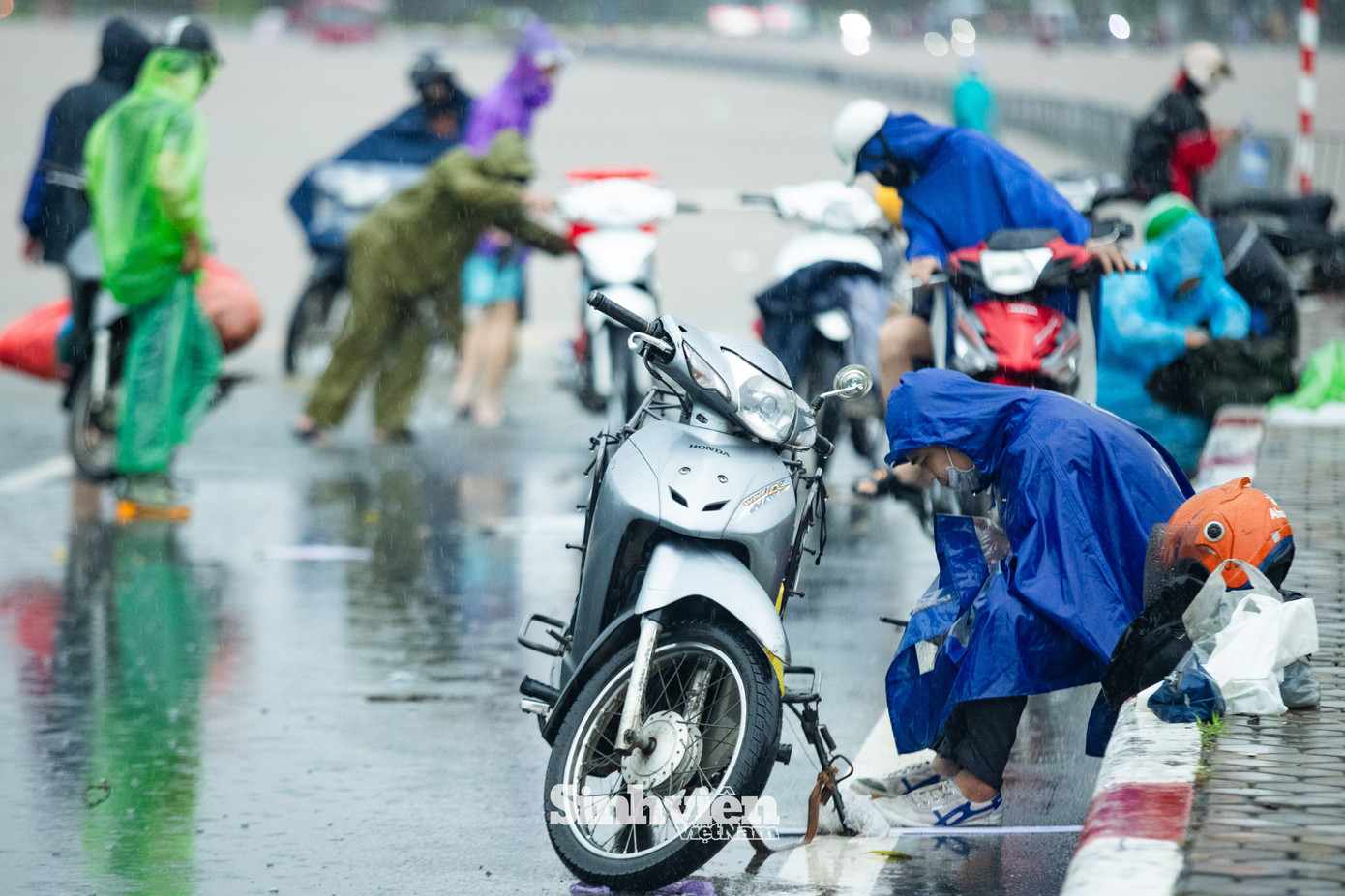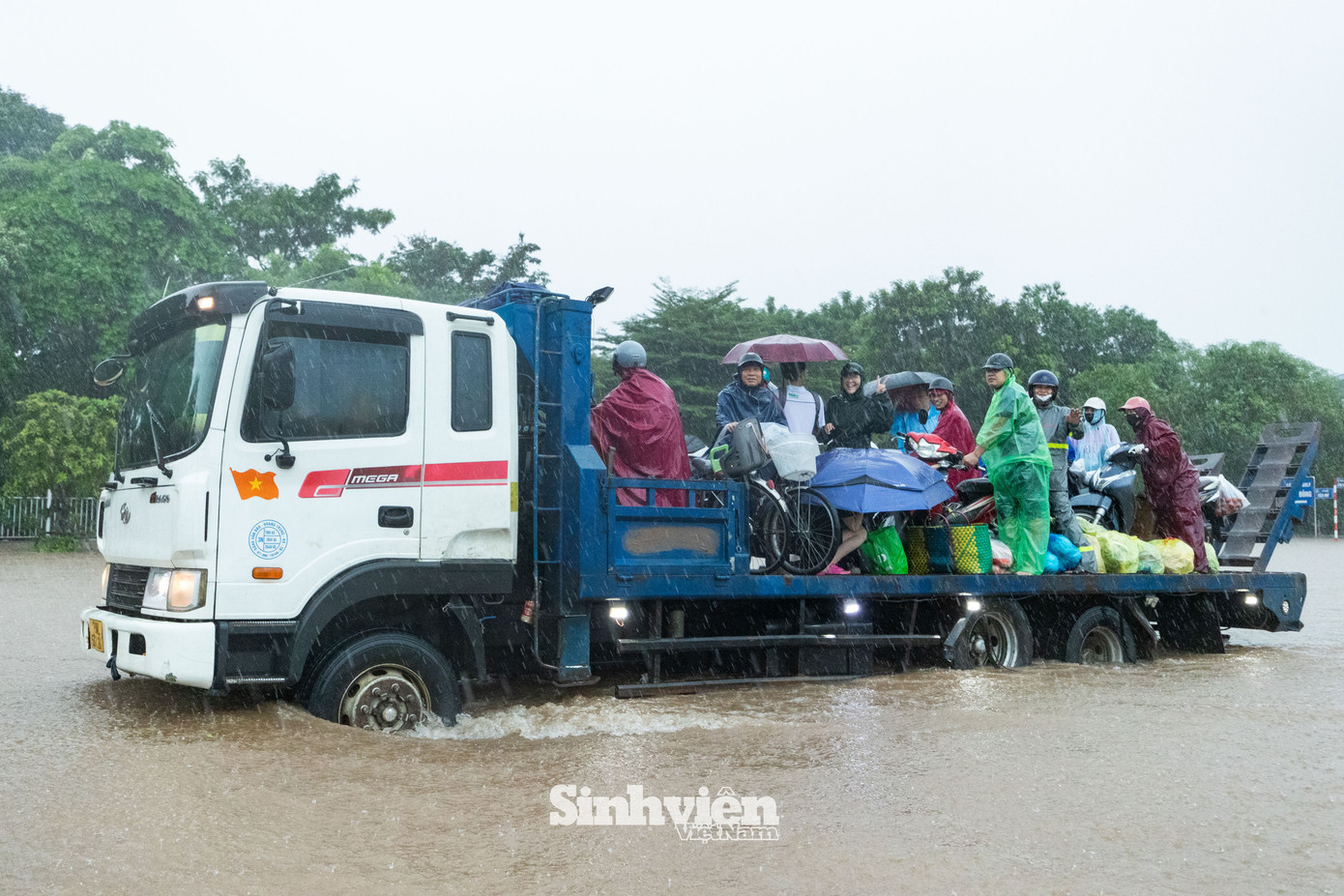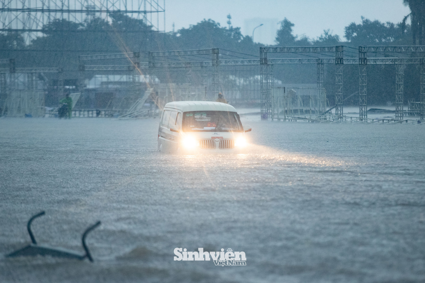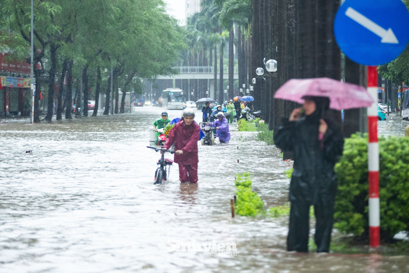 Mưa vẫn trắng xóa trời, tầm nhìn hạn chế. Bất chấp nguy hiểm, nhiều người dân vẫn cố gắng điều khiển xe máy, ô tô di chuyển qua các đoạn ngập. Những chiếc xe tải, xe buýt lớn đi qua tạo thành những đợt sóng mạnh, hất tung nước, khiến nhiều người đi xe máy loạng choạng, đổ xe giữa dòng nước.