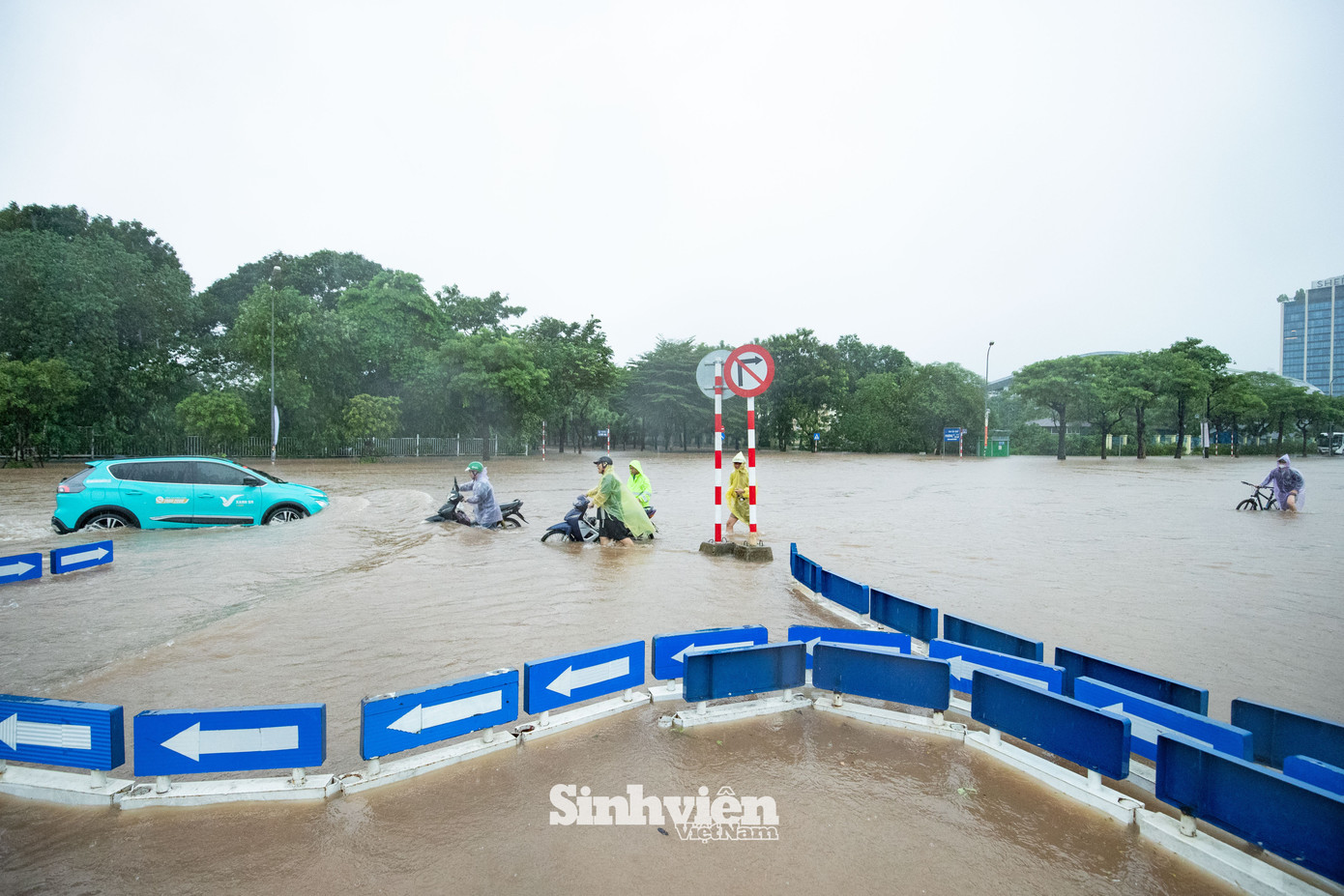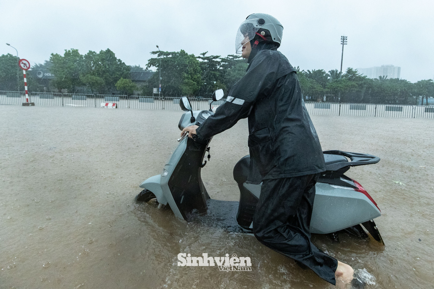 Ghi nhận lúc 7 giờ sáng 7/10 tại sân vận động Mỹ Đình: Mưa lớn không ngớt gây ngập sâu. Nhiều người lao động phải xuống dắt xe máy lội bì bõm trong dòng nước đã dâng cao quá nửa xe để tiếp tục hành trình đi làm."