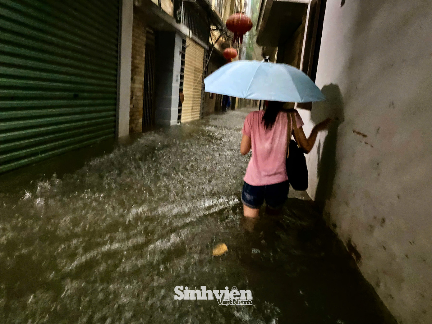 5h30 sáng, khi thành phố vẫn còn chìm trong giấc ngủ, chị Huệ (sinh năm 2000), một nhân viên y tế, đã vội vã bước ra khỏi nhà để đến bệnh viện. Chị bàng hoàng khi con ngõ nhỏ đã ngập sâu đến đầu gối. "Cơn mưa to từ đêm qua đã khiến tôi lường trước được tình hình. Mình đặt báo thức lúc 5h sáng với hy vọng có thể đến bệnh viện trước khi nước dâng cao không đi được nữa. Nhưng không ngờ, vừa mở cửa ra nước đã ngập quá đầu gối rồi." - Chị Huệ chia sẻ trong lúc bì bõm lội nước. Biết rằng không thể quay về, chị đành liều mình lội qua dòng nước đang ngày một dâng cao để đến cơ quan. Chị cho biết đã chuẩn bị sẵn một bộ quần áo khô, sạc dự phòng điện thoại và sẵn sàng tâm lý ở lại bệnh viện nếu mưa ngập không thể về nhà.