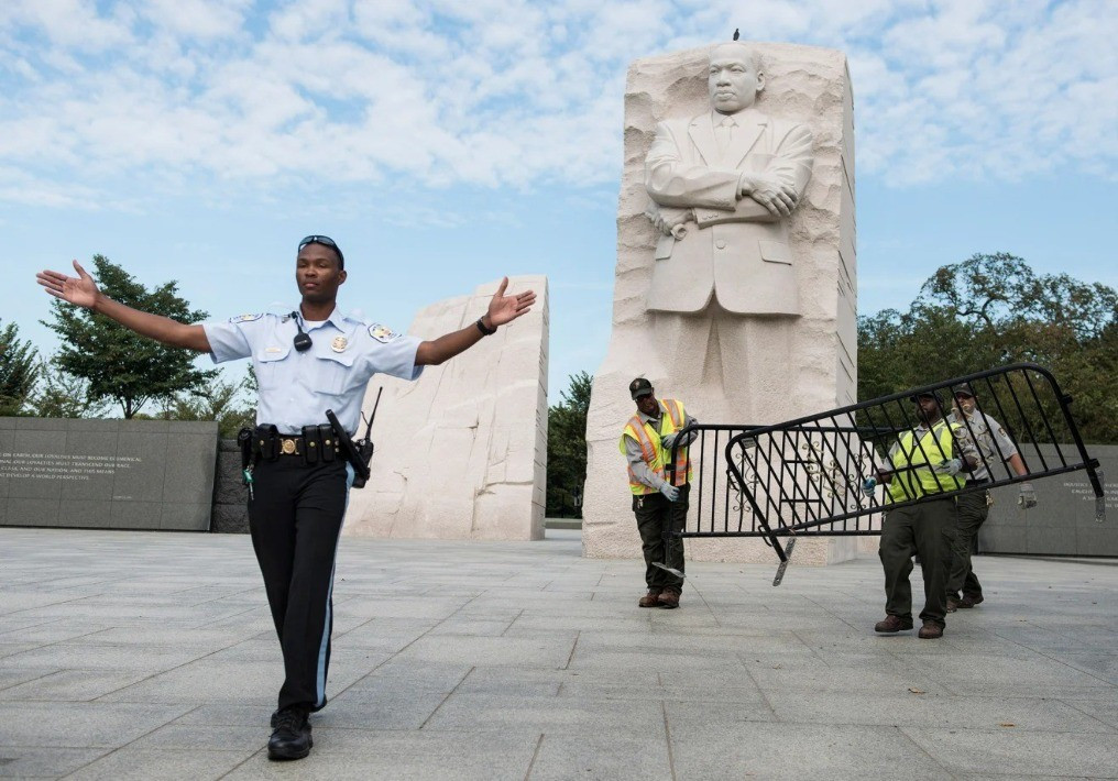 Một sĩ quan Cảnh sát Công viên Hoa Kỳ và nhân viên Cục Công viên Quốc gia đóng cửa Đài tưởng niệm Martin Luther King Jr. ở Washington, DC, trong thời gian đóng cửa vào tháng 10/2013. Brendan Smialowski/AFP/Getty Images
