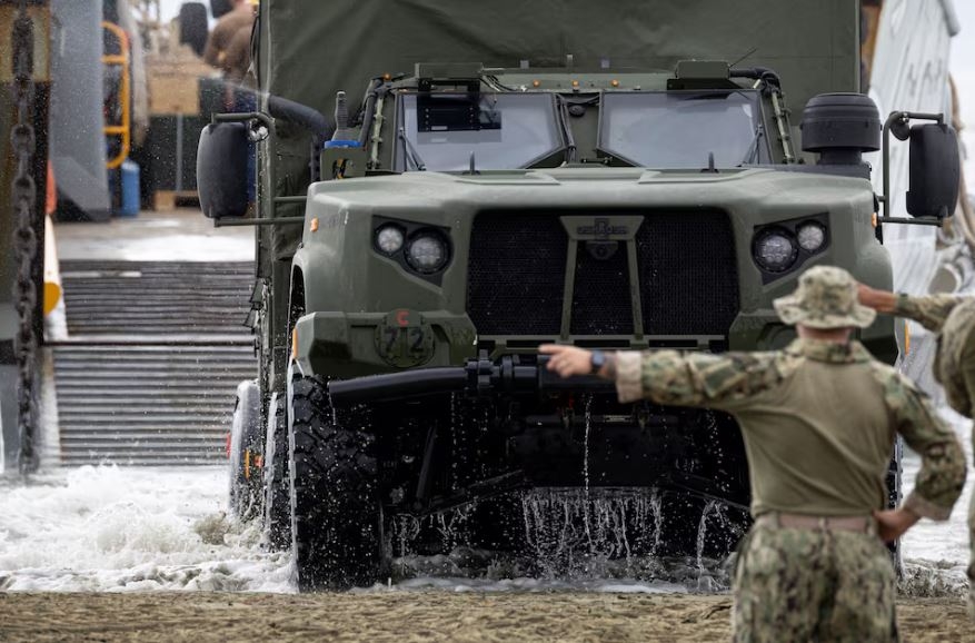 Một tàu đổ bộ đa dụng (LCU) của Hải quân Mỹ đang dỡ một xe chiến thuật hạng nhẹ (JLTV). Ảnh: Reuters