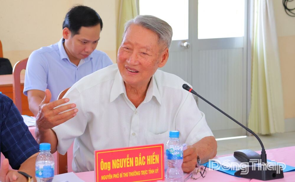Đồng chí Nguyễn Đắc Hiền, nguyên Phó Bí thư Thường trực Tỉnh ủy góp ý kiến tại Hội thảo hoàn thiện hồ sơ đề nghị công nhận xã Mỹ Hiệp là xã An toàn khu.