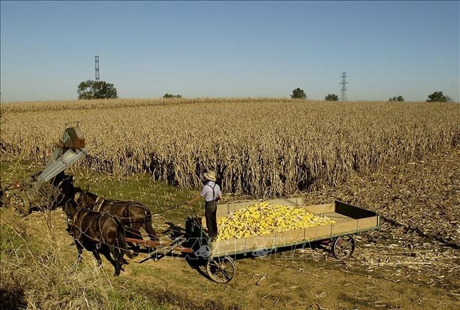 Nông dân thu hoạch ngô trên cánh đồng ở Bird-in-Hand, bang Pennsylvania, Mỹ. Ảnh: AFP/TTXVN