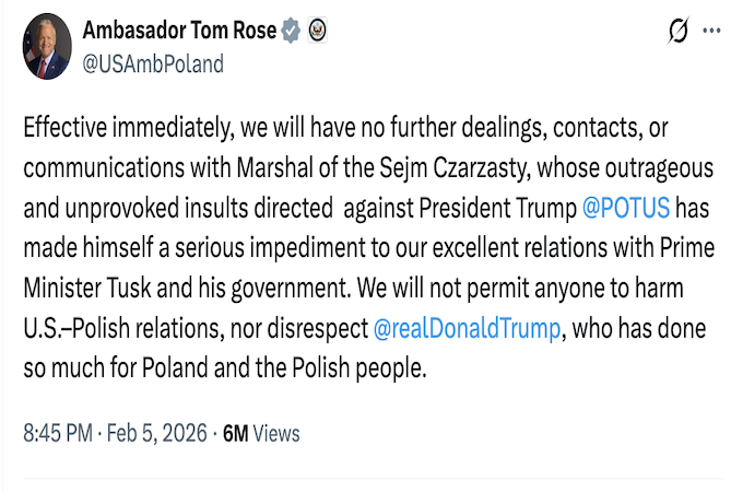 Vào tối 5/2/2026, Đại sứ Mỹ tại Ba Lan Tom Rose đã cáo buộc Chủ tịch Hạ viện Ba Lan Wlodzimierz Czarzasty làm tổn hại quan hệ song phương, tuyên bố sẽ lập tức "không còn bất kỳ giao dịch, tiếp xúc hay liên lạc nào với Chủ tịch Hạ viện Czarzasty” vì quan chức này đã có những “lời xúc phạm vô cớ và quá đáng” với Tổng thống Mỹ Donald Trump. Ảnh chụp màn hình