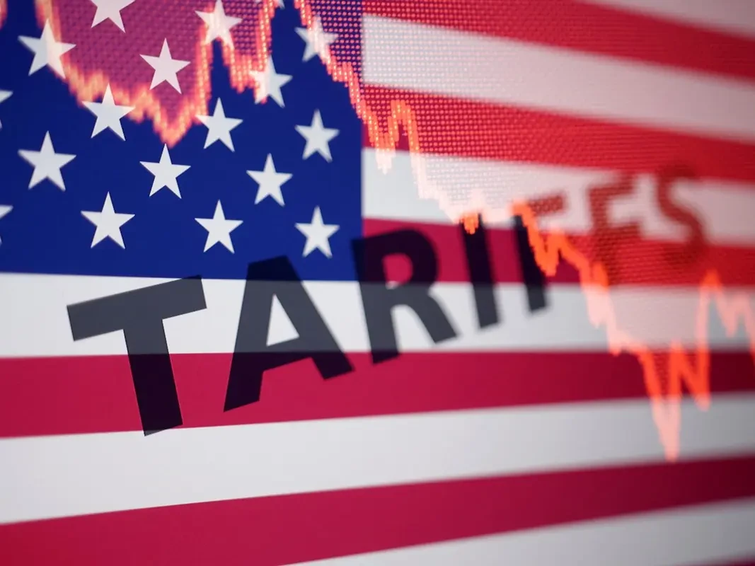 Hình ảnh lá cờ Mỹ với dòng chữ “thuế quan” được thể hiện trong bức ảnh chụp ngày 7 tháng 4 năm 2025. Ảnh: Reuters