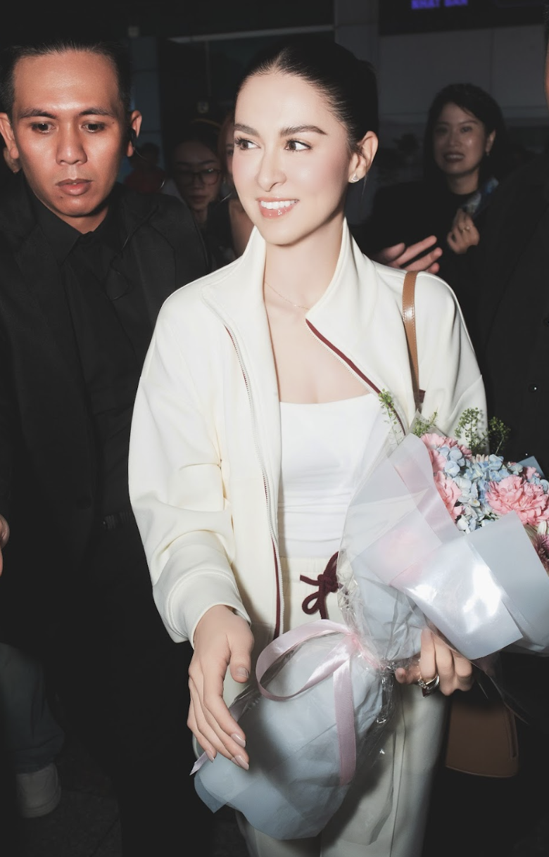 "Mỹ nhân đẹp nhất Philippines" thu hút với phong thái rạng rỡ, tươi tắn. Trong lần đến Việt Nam, cô diện trang phục trẻ trung, năng động. Người đẹp trang điểm nhẹ, tóc búi cao và liên tục vẫy tay chào fan.