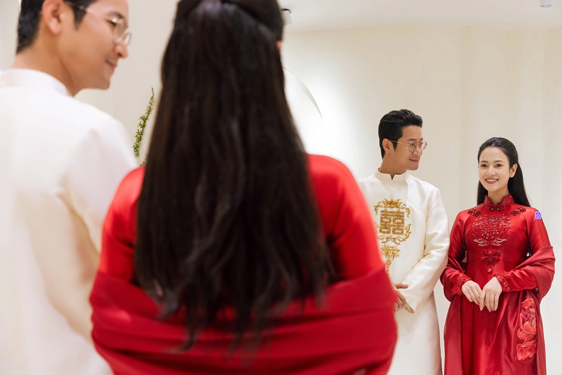 Trong bộ ảnh, nữ diễn viên diện hai mẫu áo dài cưới tông trắng và đỏ, được đính kết cầu kỳ. Cô lựa chọn phong cách trang điểm nhẹ nhàng, kiểu tóc thanh lịch để tôn vẻ dịu dàng. Ông xã Trọng Trí cũng thử hai thiết kế áo dài trắng đồng điệu với vợ. Cả hai thoải mái tạo dáng, luôn giữ nụ cười rạng rỡ trong suốt buổi thử đồ.