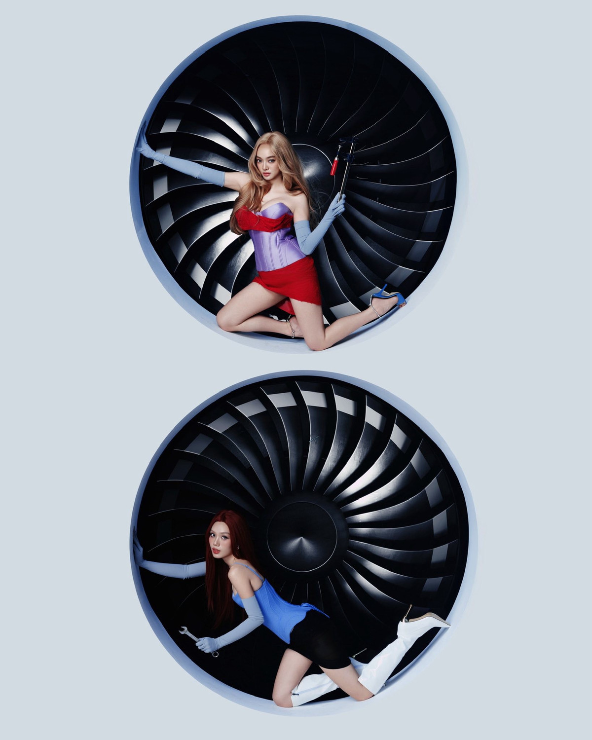 Điểm nhấn đặc biệt nằm ở background là cánh quạt động cơ máy bay, tạo nên khung cảnh vừa hiện đại, vừa mạnh mẽ, khiến Kaity Nguyễn trông như một tiếp viên hàng không phiên bản thời trang cao cấp.