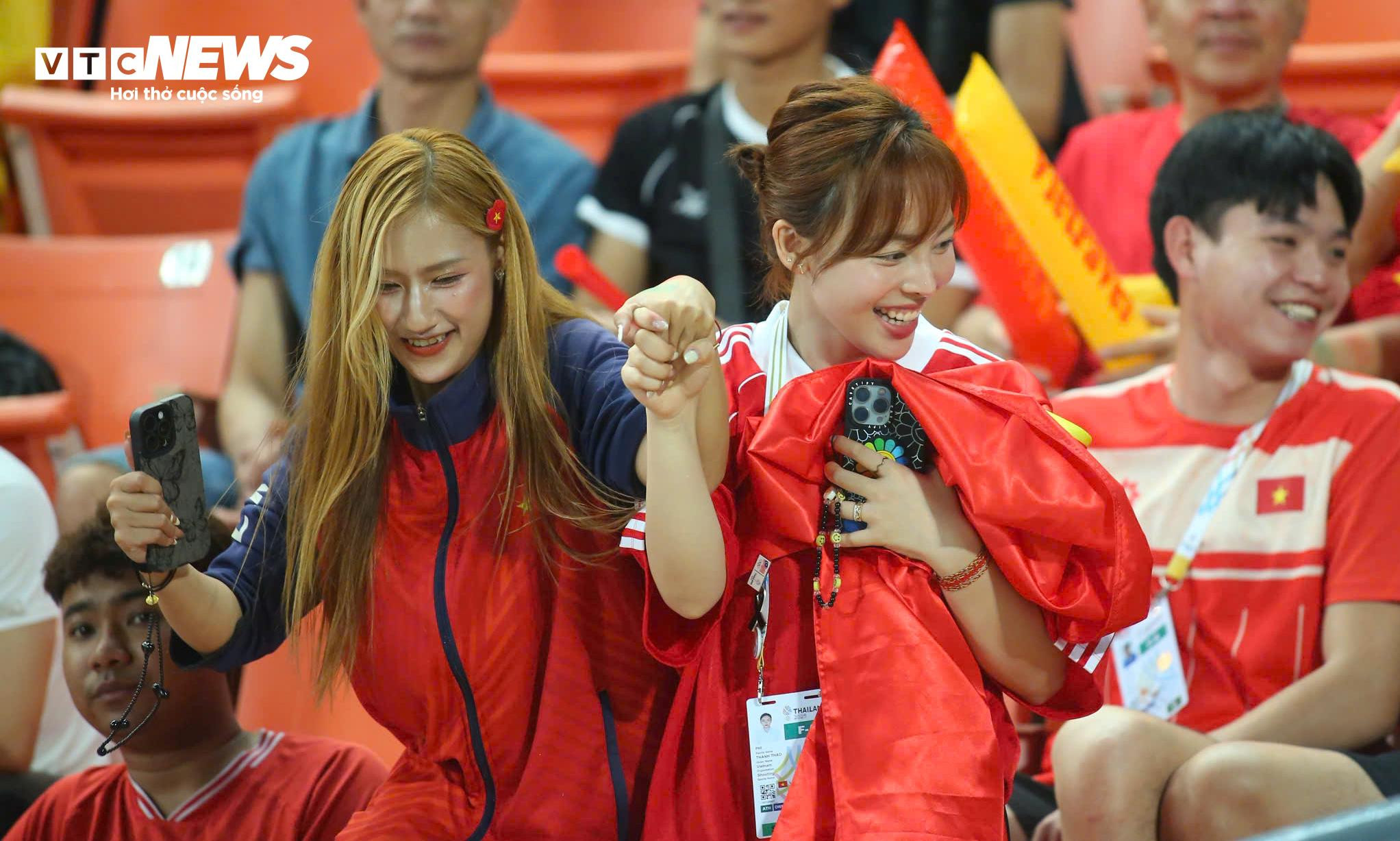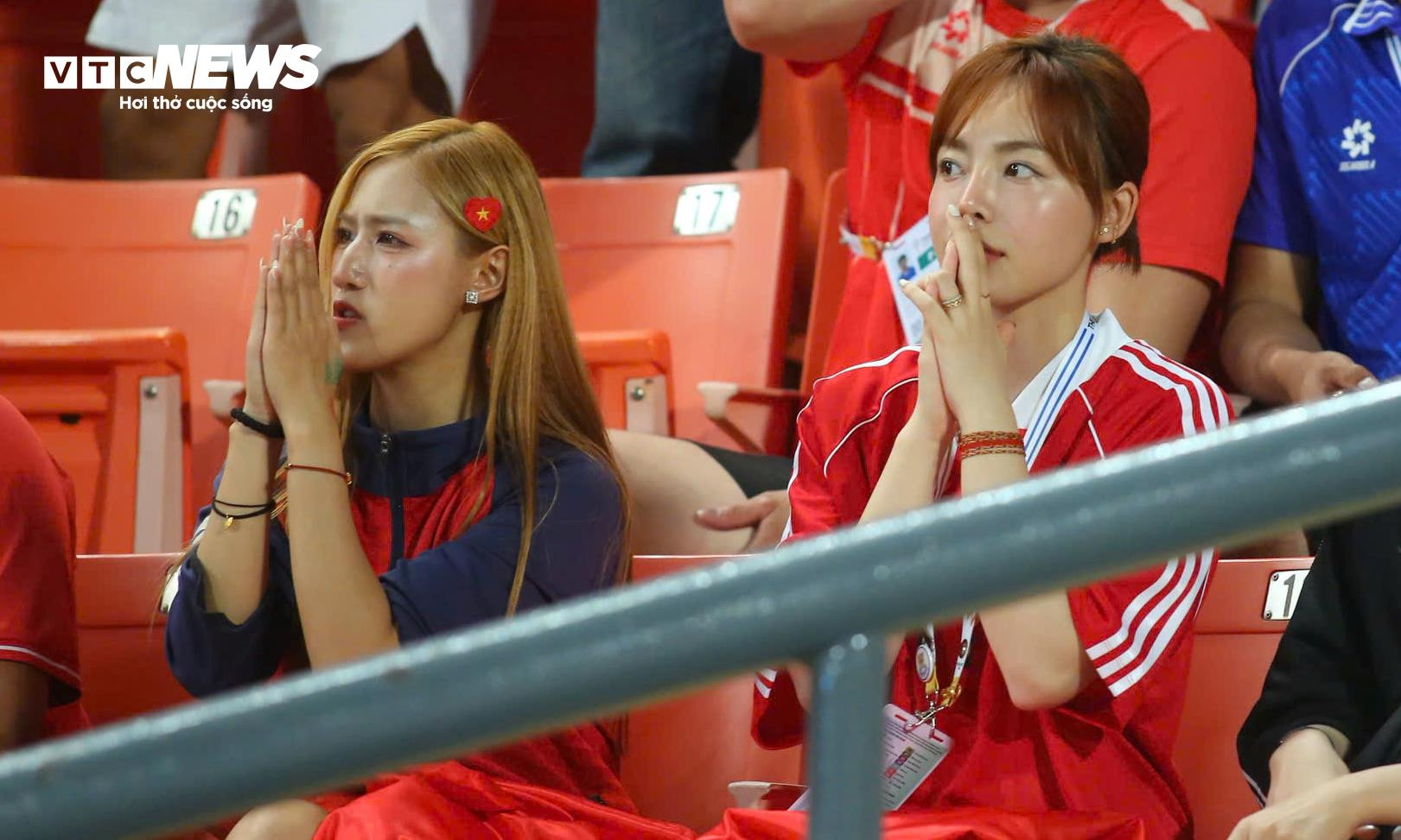 Vận động viên nhảy cầu Nguyễn Phương Anh và xạ thủ Phí Thanh Thảo hồi hộp dõi theo từng pha bóng cùng hàng nghìn CĐV khác.