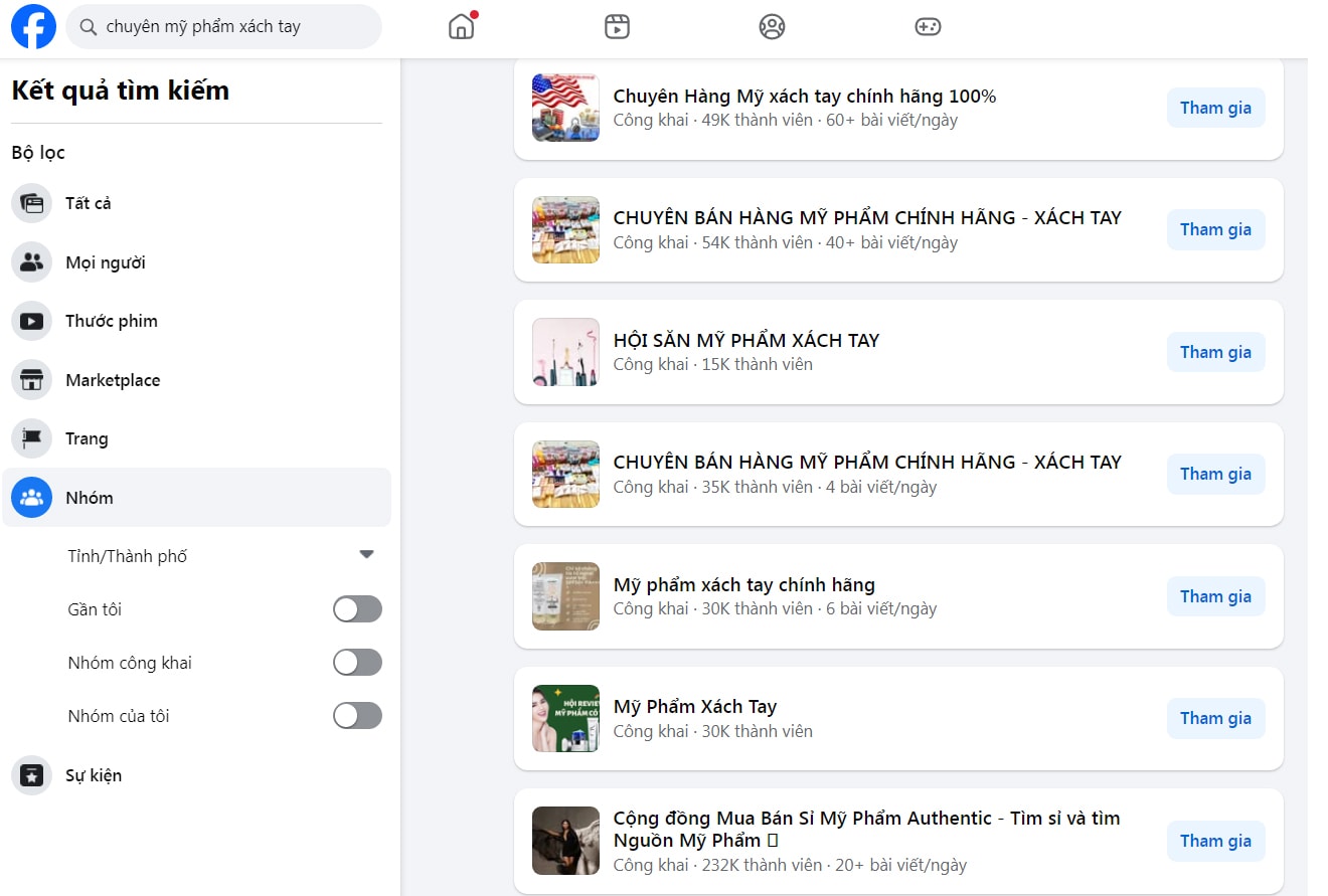 Rất nhiều nhóm mỹ phẩm xách tay trên mạng xã hội Facebook - Ảnh chụp màn hình