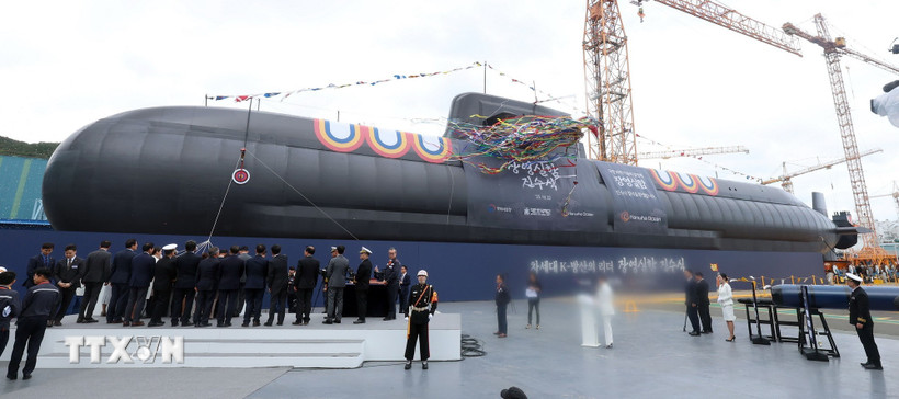 Lễ hạ thủy tàu ngầm tấn công đầu tiên thuộc lớp 3.600 tấn tại Geoje, Hàn Quốc, ngày 22/10/2025. (Ảnh: Yonhap/TTXVN)