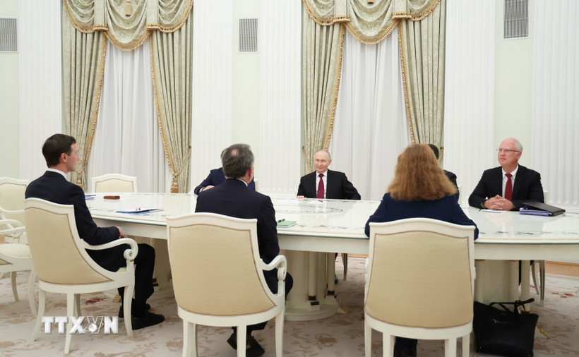 Tổng thống Nga Vladimir Putin trong cuộc gặp với đặc phái viên của Tổng thống Mỹ, ông Steve Witkoff và ông Jared Kushner tại Moskva ngày 2/12/2025. (Ảnh: AA/TTXVN)