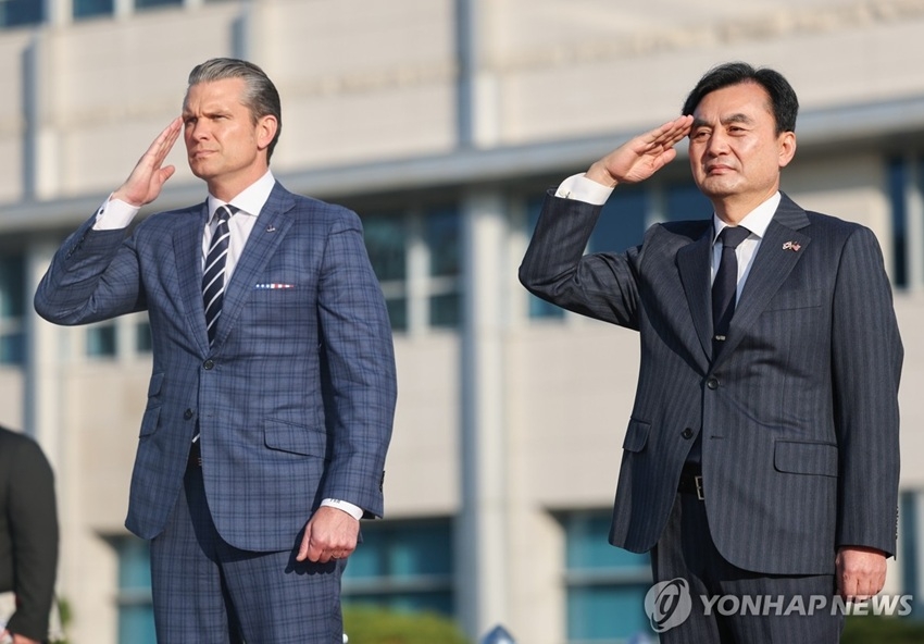 Bộ trưởng Quốc phòng Hàn Quốc Ahn Gyu-back và Bộ trưởng Bộ Chiến tranh Mỹ Pete Hegseth nhóm họp tại Seoul hôm 4-11-2025. Ảnh: Yonhap News