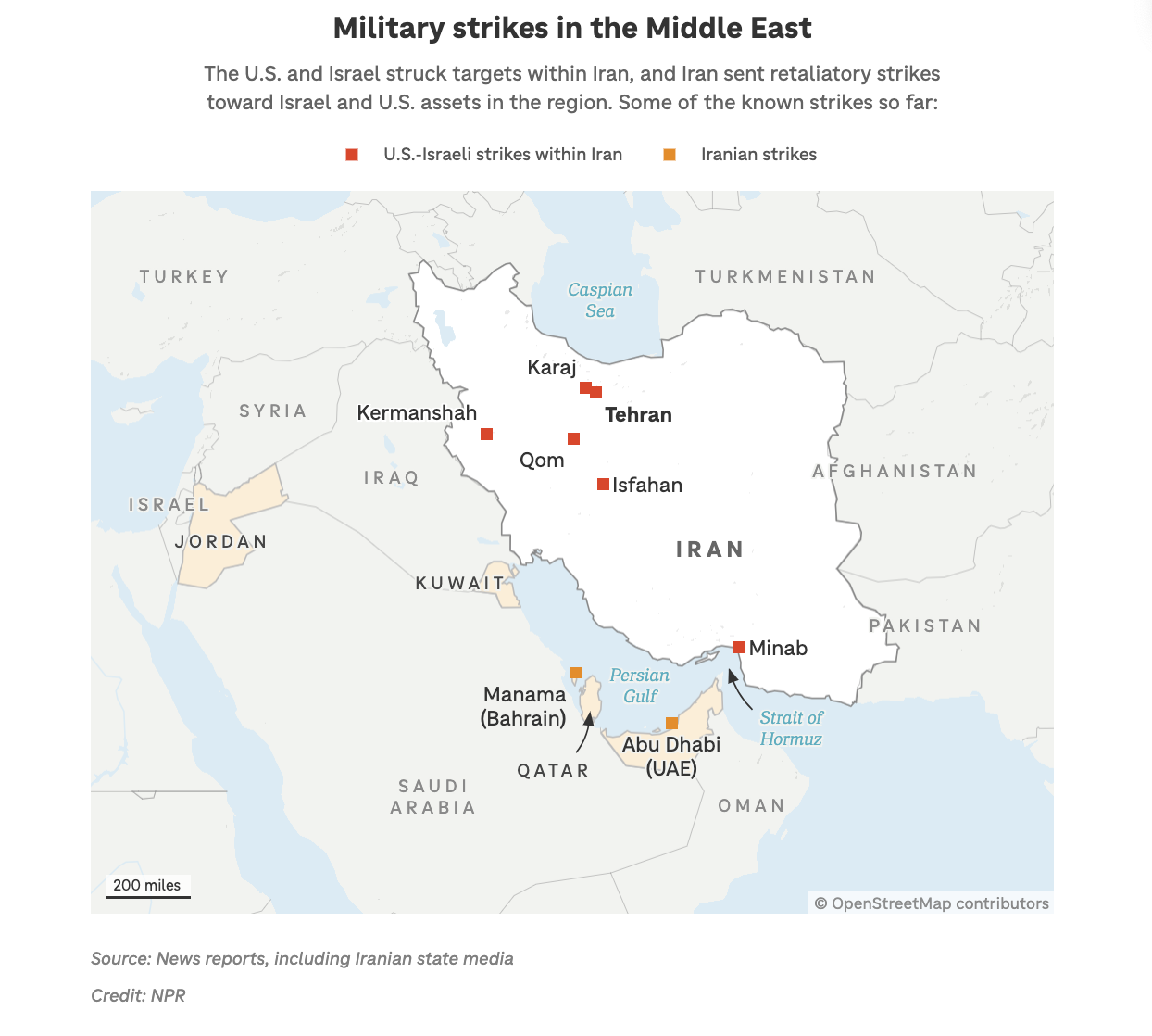 Bản đồ cho thấy các cuộc tấn công của Mỹ và Israel vào các mục tiêu bên trong Iran (màu đỏ) và các đòn đáp trả của Iran nhằm vào Israel và các tài sản của Mỹ trong khu vực (màu cam). Nguồn: Các báo cáo tin tức, bao gồm truyền thông nhà nước Iran. Thiết kế: NPR