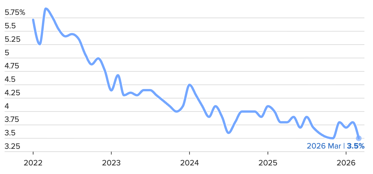 Tăng trưởng tiền lương theo giờ ở Mỹ so với cùng kỳ năm trước từ tháng 1/2022 đến tháng 3/2026 - Nguồn: BLS/CNBC.
