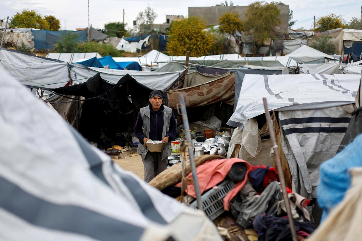 Một người đàn ông Palestine, bị buộc phải rời bỏ nhà cửa trong cuộc tấn công kéo dài 2 năm của Israel, đang nhìn vào một trại lều dành cho các gia đình tị nạn ở Nuseirat, trung tâm Dải Gaza, ngày 25/3/2026. Ảnh REUTERS/Mahmoud Issa