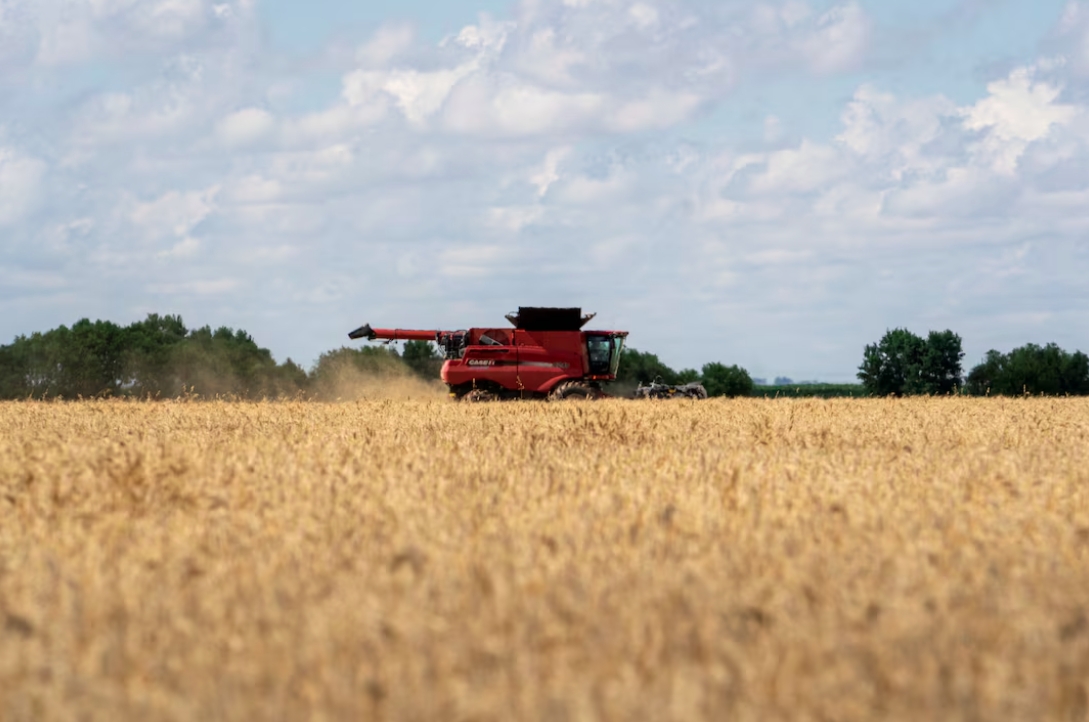 Một máy gặt đập liên hợp được sử dụng để thu hoạch lúa mì ở Kremlin, Oklahoma, Mỹ ngày 12/6. Ảnh: Reuters