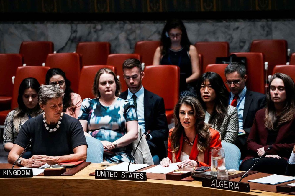 Bà Morgan Ortagus (áo đỏ hàng đầu) phát biểu tại một phiên họp của Hội đồng Bảo an Liên Hợp Quốc. Ảnh: Middle East Online