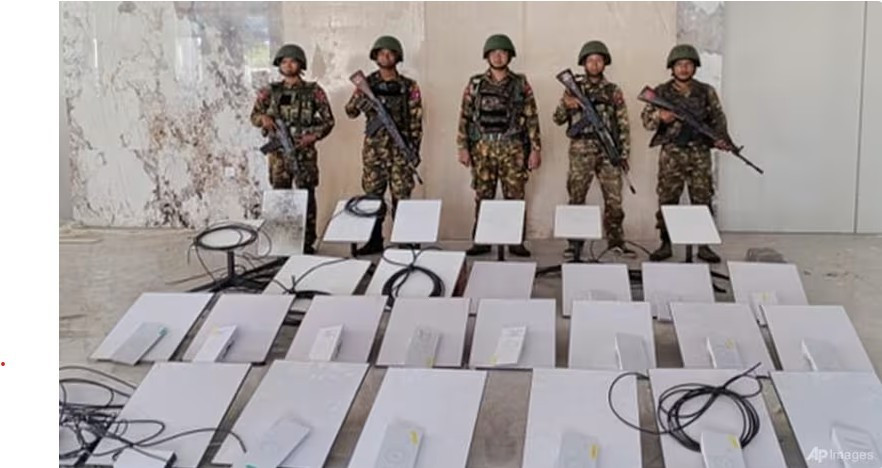 Binh lính Myanmar đứng trước loạt thiết bị Starlink thu giữ được trong chiến dịch truy quét trung tâm lừa đảo. (Ảnh: AP)