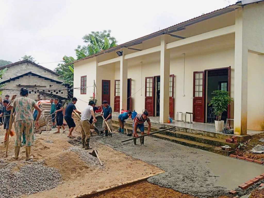 Nhân dân xóm Nà Bon làm sân nhà văn hóa xóm.