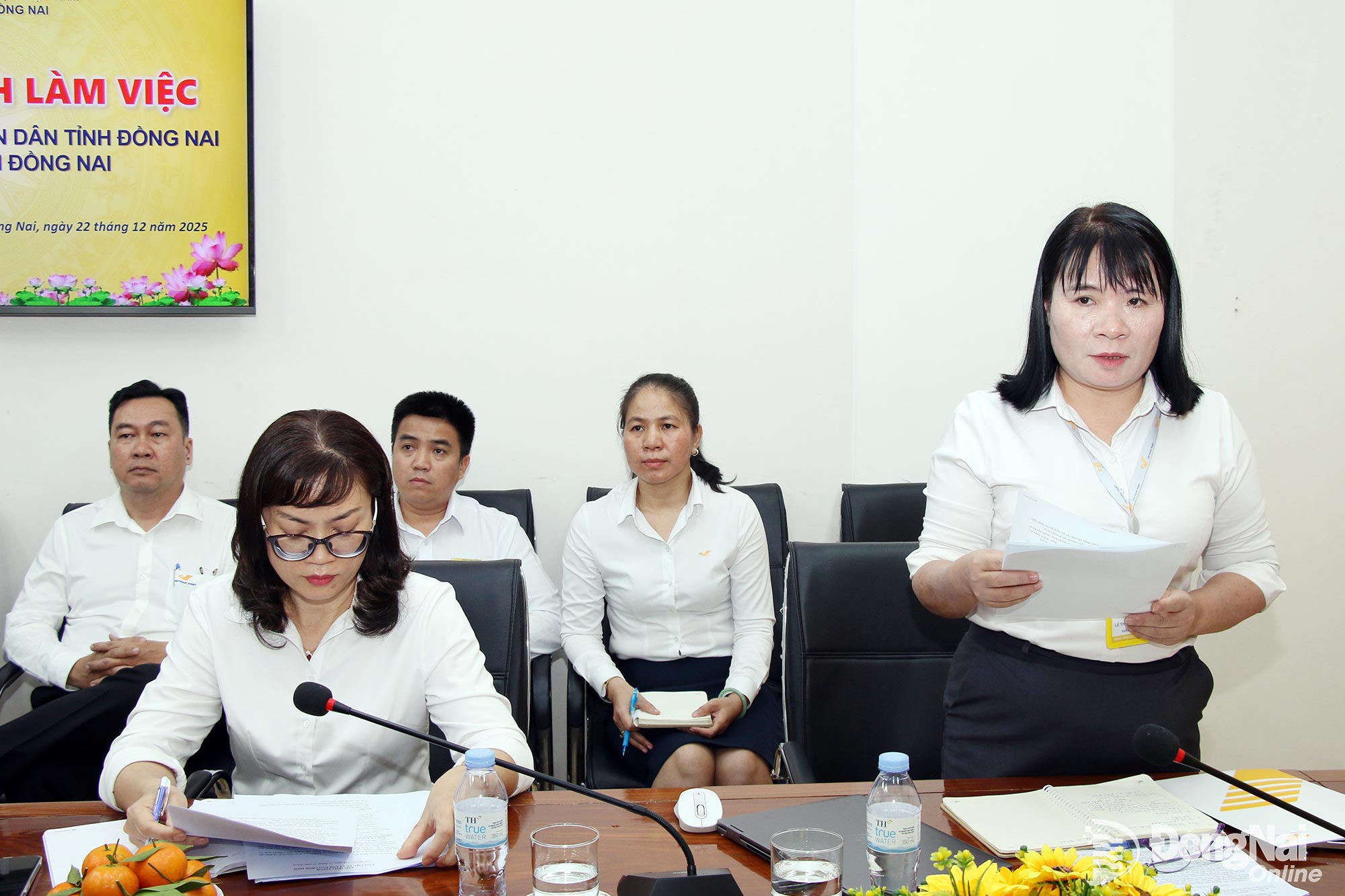 Giám đốc Bưu điện tỉnh Đồng Nai Lê Thị Hà Nhung báo cáo tình hình thực hiện các nhiệm vụ, kết quả kinh doanh năm 2025 của đơn vị. Ảnh: Hải Quân